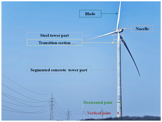 This study focused on a practical project as the analysis object. The project is in a suburb of Anhui Province, China. There are 14 steel–concrete hybrid segmented wind turbine towers with a hub height of 160 m, a rated power of 5 MW, and a rotor diameter of 195 m. The segmented steel–concrete hybrid towers consist of the concrete tower part, transition section, steel tower part, nacelle, and blade (Figure 1). Due to production and transportation reasons, the concrete tower part needs to be segmented horizontally and vertically, forming horizontal and vertical joints. A single piece of concrete tower is called a concrete tower segment, and a tube formed by several concrete segments is called a concrete tower section. When the concrete tower sections are vertically stacked into a tower part, the vertical joints between adjacent sections need to be staggered by a certain angle to keep away from continuous vertical joints.