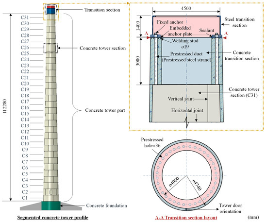 The steel tower part is not the primary focus of this study, as its structure is relatively straightforward and does not necessitate finite element analysis. In contrast, the concrete tower part and the transition section represent the more vulnerable aspects of the overall structure, which will henceforth be referred to as the segmented concrete tower in this text. To explore the structural performance of segmented steel–concrete wind turbine towers, this study established a numerical model of the segmented concrete tower to investigate its structural performance under various conditions and the effects of the friction coefficient, prestress loss, and contact area on the anti-slip performance of the transition section of the towers. The tower model structure and parameters are shown in Figure 2. The tower model mainly employs a structural form consisting of a transition section (steel and concrete transition section) and a concrete tower part. The concrete tower part is 112.28 m in height and consists of 31 concrete tower sections. The concrete transition section and the steel transition section are connected by prestressed steel strands. According to the China standard for steel strands for prestressed concrete (GB/T 5224-2023) [19], a total of 36 high-strength and low-relaxation prestressed steel strands are utilized in a circular uniform layout. According to the China standard for design of tall structures (GB 50135-2019) [20], the safety grade of the tower is grade 2 (which means the damage consequences are serious and the type of high-rise structure is a general high-rise structure), and the design service life is 20 years.