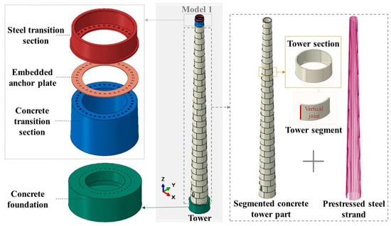 ABAQUS 2020 software was utilized to build the finite element model of the segmented concrete tower. The model consisted of the steel transition section, embedded anchor plate, concrete transition section, concrete tower part, prestressed steel strand, and concrete tower foundation. Among them, the steel transition section, embedded anchor plate, concrete transition section, concrete tower part, and concrete tower foundation were all established using the C3D8R elements. The entire tower was modeled using approximately 110,000 C3D8R elements, with a basic grid spacing of 500 mm and a finer grid spacing of 100 mm for the critical analysis sections at the top. Referring to the relevant literature [21,22], all components, including steel transition sections and concrete sections, had more than three elements set along the thickness direction. The line model of prestressed steel strands was established using the B31 elements. As shown in Figure 3, the specific details of modeling were as follows: