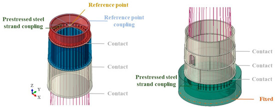 The boundary condition and interaction of the model are shown in Figure 4. The bottom of the concrete foundation was set and completely fixed. The top surface of the foundation was in contact with the bottom surface of the tower, the upper and lower surfaces of each section inside the tower were in contact with each other, and the top surface of the embedded anchor plate was in contact with the bottom surface of the steel transition section, considering the contact displacement of the above parts. The pressure was transferred in the normal direction. Normal behavior was hard contact, simulating contact separation. The friction was transferred in the tangential direction. Finite sliding was adopted. The tangential friction coefficients were consistent, specifically 0.6 for concrete–concrete interactions and 0.4 for concrete–steel interactions. The bottom surface of the embedded anchor plate was tied to the top surface of the concrete tower, regardless of their displacement. The upper-end point of the strand was coupled with the opening on the upper surface of the lower flange of the transition section, and the lower-end point of the strand was coupled with the opening on the inner lower surface of the foundation platform.