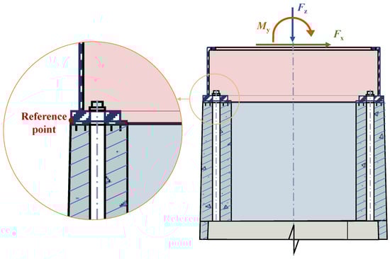 As shown in Figure 5, reference points were selected on both the embedded anchor plate and the steel transition section. These reference points were positioned on the outermost side of the tensile side corresponding to the main bending moment. Initially, when no load was applied, these two reference points coincided perfectly. However, they experienced relative displacement once loads were introduced. WC-1 represents the load value under normal operating conditions, where adjustments to the loading direction identified the X-direction as the most unfavorable—specifically indicating that My and Fx reached their maximum values—which facilitated subsequent research and analysis. WC-2 denotes the load value under ultimate loading conditions incorporating a safety factor; this involved multiplying by an importance factor of 1.1 to derive its final value. In contrast, WC-3 refers to loads calculated under ultimate loading conditions using partial factors: here, vertical load Fz was multiplied by a partial factor of 1.2 while lateral loads Fx, My, and Mz were each multiplied by a partial factor of 1.4, ultimately yielding results through overall multiplication by an importance factor of 1.1.
