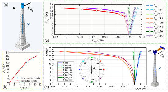 Model verification: (a) model; (b) simulated and experimental results (FQz-Uz); (c) simulated results (FQz-UXQz); (d) experimental results (FQz-UXQz) [12].