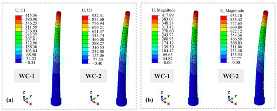 The X-direction deformation and the three-direction composite deformation contours of the overall model under the normal operating conditions (WC-1) and safety factor considerations (WC-2) are shown in Figure 7.
