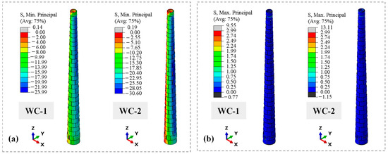 The minimum and maximum principal stress contours of the tower under the normal operating (WC-1) and safety factor considerations (WC-2) are shown in Figure 8. For convenience, when the minimum value of the maximum principal stress was 0.00 MPa, the elements less than this value are shown in black, indicating three-way compression elements. When the maximum value of the minimum principal stress was 0.00 MPa, the elements greater than this value are displayed in gray, indicating the three-way tension elements. The results showed that most tensile stresses were not more than 1.00 MPa and a small part of them had a stress concentration phenomenon. The distribution of compressive stress was uniform, and there was a high distribution area of compressive stress on the compressive side under the action of the central bending moment. Under WC-1, the maximum compressive stress of concrete was 23.99 MPa; under WC-2, the maximum compressive stress of concrete was 30.60 MPa, which satisfied the design value of C70 compressive strength (31.80 MPa), and could meet safety standards.