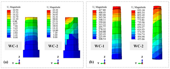 As shown in Figure 6 and Table 4, the simulated and experimental results are in good agreement at the large-scale level (the deformations at the tower head), and there is a slight deviation between the simulation and the experiment at the small-scale level (the deformations at various measurement points located in the top joint of the bottom section). On the one hand, this was due to the inaccuracy of the measurement at the small scale; on the other hand, it was because of the obvious unevenness in the production and manufacturing of concrete (which is an explanation in Klein’s paper), which was also reasonable. Overall, the simulated results demonstrated close agreement with the experimental results, confirming the validity and accuracy of the proposed modeling approach.