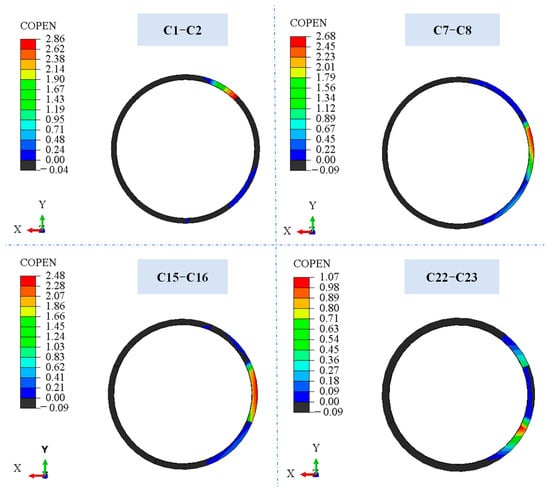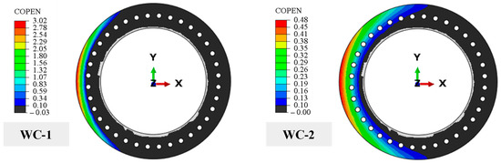 The horizontal joint separation contours of some representative concrete segments of the tower under WC-2 (no separation occurred under WC-1) are shown in Figure 10, where the torus depicted represents the contact surface. The minimum horizontal joint separation value was 0.00 mm, as shown in Figure 9. Areas below this threshold are displayed in black, indicating good contact. Conversely, areas exceeding this threshold are displayed in color, signifying contact separation (more than 0.1 mm). These values represent the distance of normal separation. The results showed that only certain areas on the tension side exhibited separation, and these separations were minimal. Overall, most horizontal joint separations were on the order of 1 mm, and the separations in the middle of the tower were larger than at the top and bottom. Notably, separations were present solely under WC-2 and remained minor throughout. Thus, the overall safety of the tower could be considered.