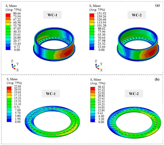 In line with established methodologies in the literature [25,26], this study employed an equivalent static loading approach, excluding dynamic and fatigue effects from the analysis. In the simulation, four load conditions were considered: prestressed situations, normal operation (WC-1), safety factor considerations (WC-2), and extreme loads (WC-3). The load values of the last three load conditions are shown in Table 3.