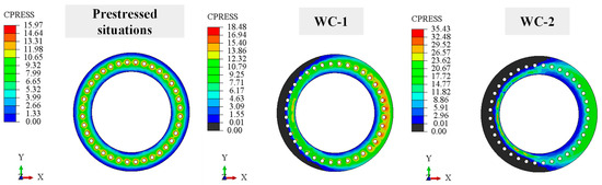 The contact stress contours of the contact surface between the embedded anchor plate and steel transition section under the normal operating (WC-1) and safety factor considerations (WC-2) are shown in Figure 12. The minimum contact stress value was 0.01 MPa. Areas below this threshold are displayed in black, indicating that the contact between the transition section and the embedded anchor plate was disconnected or insufficient. The results showed that under prestressed situations, the whole transition section and the embedded anchor plate were in contact, and there was a high-stress zone around the prestressed hole wall, which accorded with the actual situation. Under WC-1, the contact part between the transition section and the embedded anchor plate was disconnected, and the tension side under the central bending moment was obvious, which accorded with the ideal hypothesis. Under WC-2, the contact between the transition section and the embedded anchor plate was detached, and about 50% of the surface was no longer in contact.