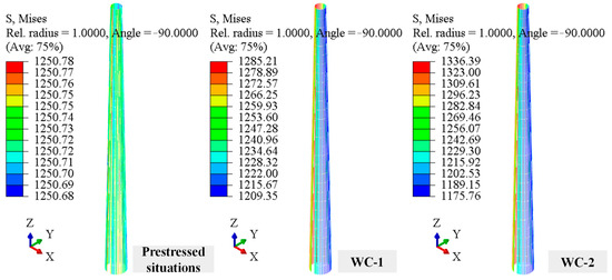 The Mises stress contours of the prestressed steel strand under the prestressed situations, normal operation (WC-1), and safety factor considerations (WC-2) are shown in Figure 14. The results showed that under the prestressed situations, the prestress of the steel strand was evenly distributed, about 1250.73 MPa, which aligns with the design value of 1250 MPa. This consistency suggested that the application of prestressing met expectations. Under WC-1 and WC-2, due to deformation coordination, the prestress on the tension side increased, while the prestress on the compression side decreased, which accorded with the ideal situation. The maximum prestress value was 1336.39 MPa, less than the strength value (1860 MPa), which could meet safety standards.