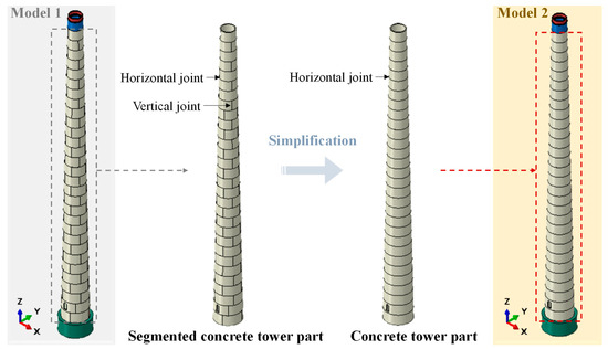 Based on Model 1, only the vertical joints in the segmented concrete tower part were simplified. The simplified model (set as Model 2) with only horizontal joints was established, as shown in Figure 15.