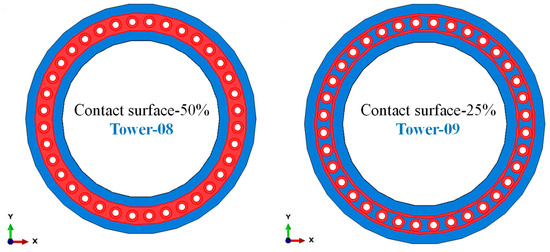 The setting diagram of the contact surface of Tower-08 and Tower-09 is shown in Figure 16, and is displayed on the upper surface of the embedded anchor plate. The highlighted area in red was the actual contact surface between the transition section and the embedded anchor plate. In Tower-08, the contact surface was set as a ring with the prestressed hole line as the symmetry axis, extending inside and outside, and the area was about 50% of the total section. In Tower-09, the contact surface was set as a ring around the prestressed hole plus two large rings inside and outside to simulate the actual situation of the waterproof rubber segment area, and the area was about 25% of the total section.