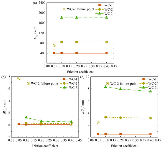 Influence of the friction coefficient on the anti-slip performance between the steel transition section and the embedded anchor plate: (a) Uxy; (b) ΔUxy; (c) ΔUz.