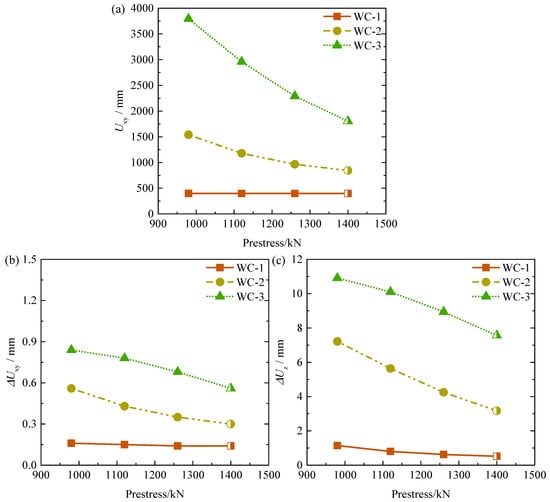 Data were selected from Tower-01, Tower-05, Tower-06, and Tower-07 for comparison, as shown in Figure 18. The results showed that the Uxy increased significantly with the increase in the prestress loss of the strand, and the increase was more obvious with the increase in the load. When the prestress loss reached 20% (1120 kN for a single beam), the Uxy under WC-2 reached 1179.08 mm, while the top height of the tower was 112.28 m, which exceeded the limit of 1/100 deformation, indicating that the prestress loss had a significant impact on the overall displacement response of the tower. As the prestress loss of the strand increased, the ΔUxy and the ΔUz both increased significantly, and the proportion increased more obviously under WC-2. This indicated that the increase in prestress loss would increase the relative displacement between the steel transition section and the embedded anchor plate, and the influence on the vertical displacement was more than that on the horizontal displacement.