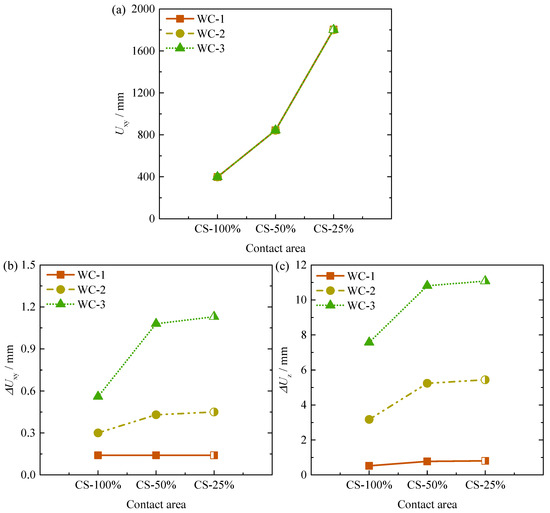 Influence of contact area on the anti-slip performance between the steel transition section and the embedded anchor plate: (a) Uxy; (b) ΔUxy; (c) ΔUz.