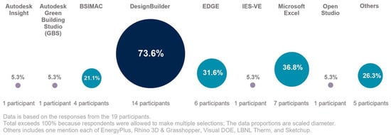 In question I, participants were asked to indicate which BEM software package(s) they use to simulate building energy performance in their practices when working on actual projects for clients. The research participants were allowed to select or specify multiple software packages. Figure 2 highlights the 14 software packages identified by practitioners. Approximately 74% of BEM practitioners use DesignBuilder, making it the most used building energy performance simulation software among South African practitioners. The other programmes selected by the participants include Microsoft Excel (37%), the EDGE App (32%), and BSIMAC (21%). Autodesk Insight, Integrated Environmental Solutions–Virtual Environment (IES-VE), and OpenStudio are some of the least-used BEM software among the respondents.