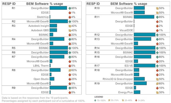 The second question asked each research respondent to rank their selected BEM software package(s) by frequency of use, by assigning a percentage value to each selection out of a cumulative of 100%. The purpose of this question was to provide context for the findings around the use of BEM software and its associated implementation. In Figure 3, participants ranked their use of preferred BEM software package(s), with 89% of practitioners utilising DesignBuilder or BSIMAC. The data indicate that these two programmes are used to simulate the building performance of 60% to 100% of their projects.