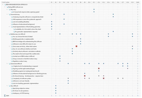 During the structured interview phase, the interviewer asked Questions III and IV as a follow-up. This provided each participant with the opportunity to elaborate on the reasons behind their preferences and their experiences when using BEM software. In question III, respondents were asked to describe their process of using energy modelling software packages to simulate building energy performance, and to explain the reason for their response in Question IV. The participants responded to Question III using a five-point Likert scale, as illustrated in Figure 4. Furthermore, their responses to Question IV were analysed as described in Section 3.2. Using the MAXQDA code system, Figure 5 classifies and highlights the commonality in the everyday experiences of practitioners. The blocks are weighted by size and colour, showing the level to which each respondent indicates that the identified theme influences their daily practice. Blocks that are larger and closer to red indicates more coded comments from the participant.