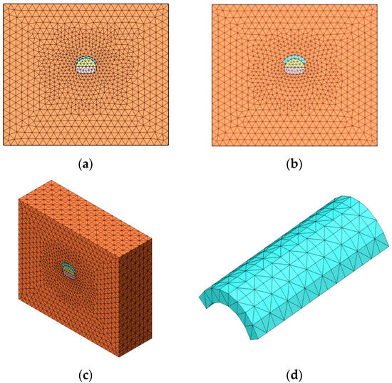 To avoid the influence of boundary effects, the width of the model is set to four to five times the diameter of the tunnel [27]. Therefore, in the horizontal direction, the width of each side is determined as 40 m away from the tunnel boundary. The vertical height along the bottom is 40 m away from the tunnel boundary. The vertical overburden from the ground surface to the tunnel crown is defined as 30 m for deep, 20 m for shallow, and 10 m for ultra-shallow tunnels.
