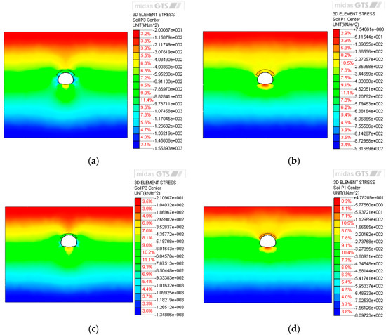 There are no constraints applied on the top of the tunnel, namely, the free boundary conditions, then the horizontal displacement constraints are applied to the two sides of the model, and for the bottom, the fixed constraints are adopted. Compared to the main tunnel section, the tunnel portal section generally has a shallow depth. Therefore, in this numerical model, the influence of tectonic stress is not considered, and only the self-weight stress of the soil is taken into account for the loading. According to the abovementioned content, the different analysis cases can be defined as Table 3.