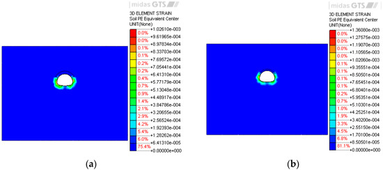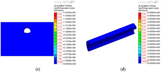 During tunnel excavation, plastic zones of varying extents emerge in surrounding areas, including the vault, haunches, connections between reinforced zones and the tunnel, sidewalls, and areas near the bottom. Among these, plastic deformation is most pronounced at the sidewalls. Due to the geometric shape of the tunnel, stress concentration tends to occur at the sidewalls and near the bottom, where the maximum strain also develops. In contrast, at the tunnel vault, the presence of plastic zones is less noticeable due to reinforcement from pre-support measures.