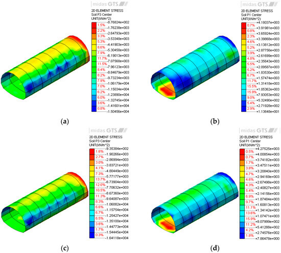 Stress of the initial support under the different cases. (a) Case I-1 maximum principal. (b) Case I-1 minimum principal. (c) Case I-2 maximum principal. (d) Case I-2 minimum principal.