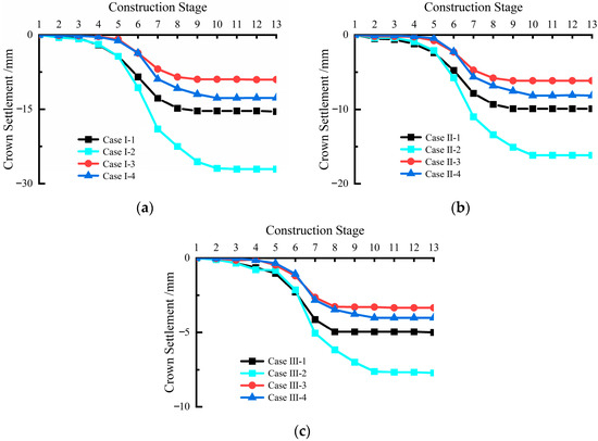 The settlement displacement at the monitoring section of the vault. (a) Case I-1~I-4. (b) Case II-1~II-4. (c) Case III-1~III-4.