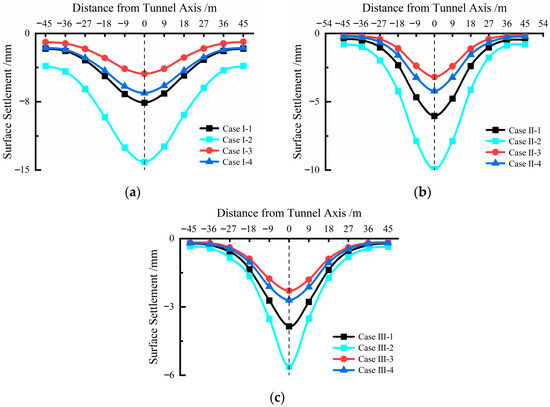 During tunnel excavation, the deformation of the surrounding rock near the tunnel gradually expands to the ground surface, resulting in the ground settlement to some degree. Regarding this point, the section of 15 m depth of the tunnel is determined to evaluate the settlement under the different cases. The analytical data of each case is extracted from the simulation and plotted in Figure 6, and the final settlements are shown in Table 7.