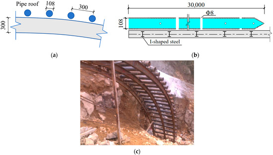With the rapid development of urban underground transportation in China, tunnel engineering projects are flourishing day by day. In order to ensure the safety of tunnel project construction, it is necessary to adopt supporting technology during tunnel excavation. The pipe roof method is a classical advanced technology in tunnel excavation and underground projection, which has been adopted for many years. The basic principle of this method is to reinforce the surrounding rock near the tunnel before the excavation; thus, the pre-support is formed to ensure the construction can be conducted in a safe working environment [1,2,3,4]. Meanwhile, the leading ductule method is another key technology for tunnel excavation. This method is to insert a specially designed small tube into the hole; then, the concrete slurry is injected into the stratum structure on the tunnel face. Thus, the mechanical performance of the soil in the tunnel has been enhanced, leading to good support effectiveness for the tunnel excavation [5,6]. The leading ductule method can be combined with a steel arch truss in practical application to further ensure the safety of tunnel excavation. Furthermore, this combination can be incorporated into the stratum structure to form a complete support measurement, the stability of the tunnel excavation working face can be ensured, and the collapse and ground settlement can be prevented [2,7,8]. The pre-support and reinforcement measurement apply to the surrounding rock to prevent deformation, tunnel collapse, and tunnel roof collapse and ensure the safety of the construction. This purpose is achieved by the following procedure: installing some steel tubes around the tunnel outline, then tubes and the surrounding rock to form a complete reinforcement area based on the concrete slurry; thus, the reinforcement area can undertake the upper load [9,10]. A tunnel project in soft rock is a common situation in practical engineering, which makes it easy to meet the problems of large deformation, tunnel face extrusion, and arch vault collapse. These difficulties set obstacles to the construction of the tunnel. Thus, it is necessary to adopt a suitable pre-support measurement to ensure the stability of the construction [11,12,13,14,15,16].