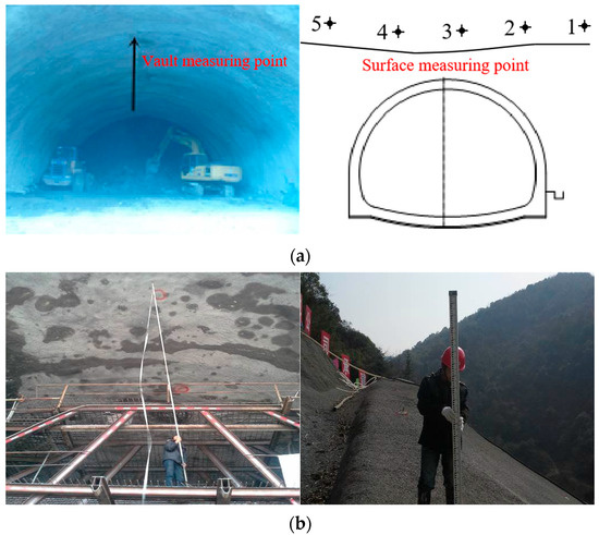 Measuring point layout: (a) measuring point layout; (b) on-site monitoring.