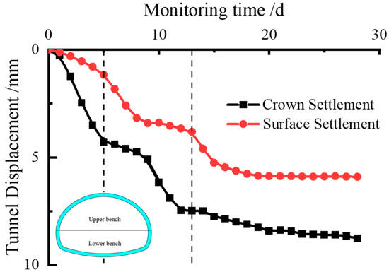 The crown settlement data from the YK10+274 section and the surface settlement data from the YK10+280 section, which were continuously monitored for 28 days until stabilization was achieved, were selected to demonstrate the typical tunnel displacement characteristics. The summarized monitoring data are shown in Figure 9 and Table 8.