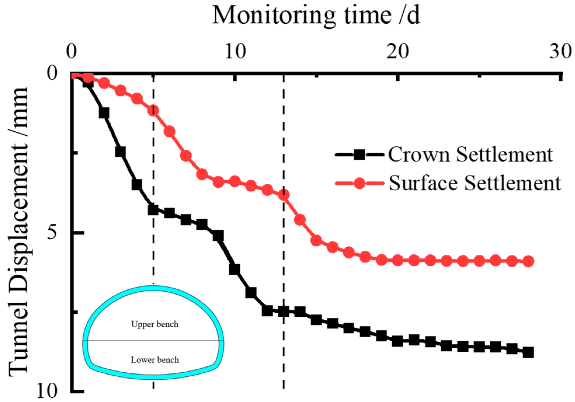 | Monitoring Section | Crown Settlement Displacement (mm) | Monitoring Section | Surface Settlement Displacement (mm) |