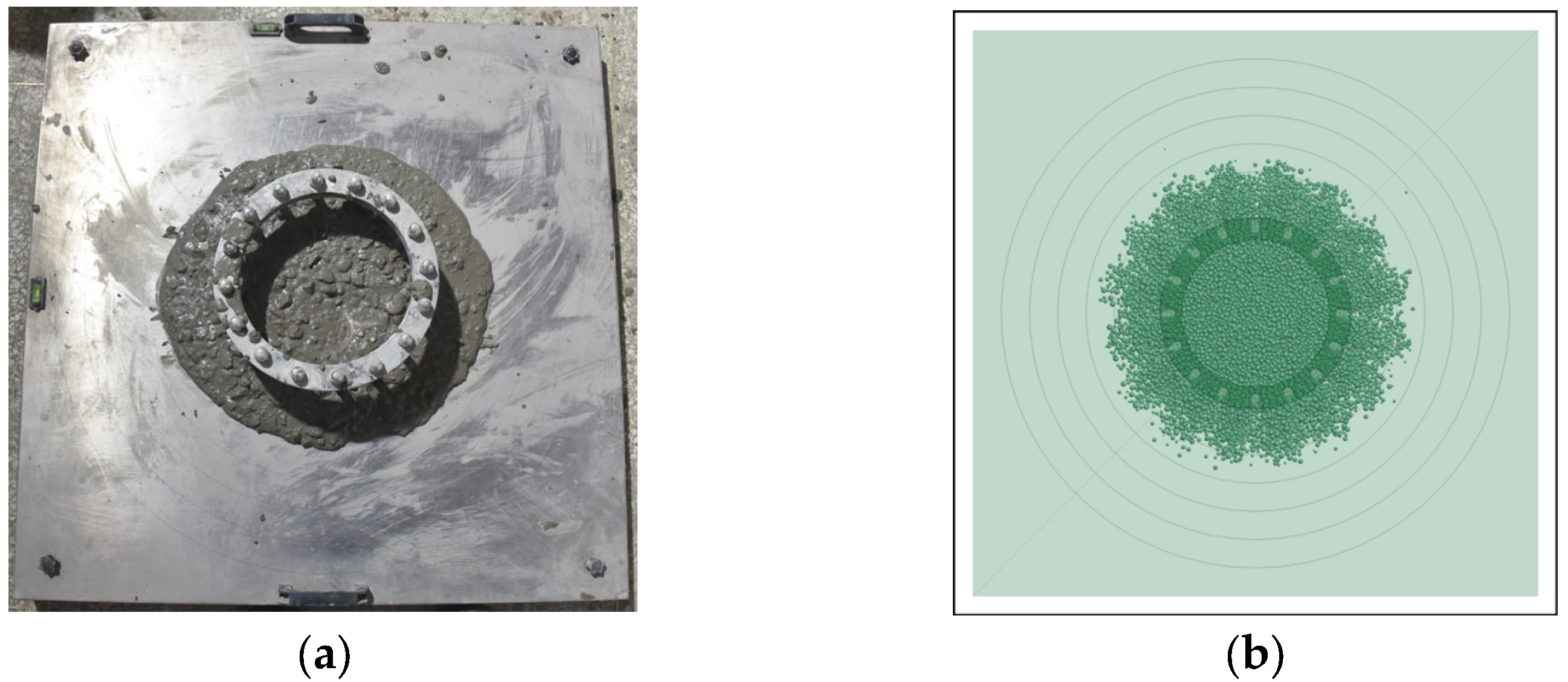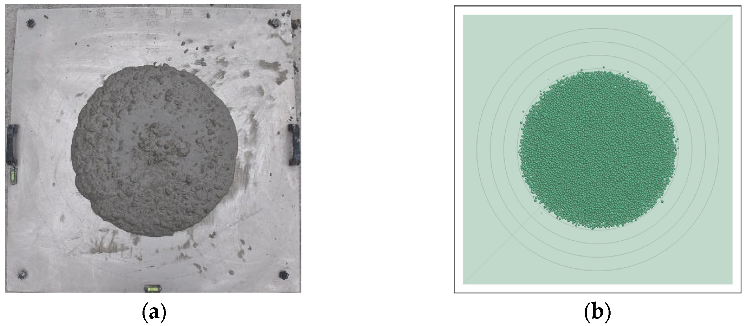 - Li, Y.; Hao, J.; Jin, C.; Wang, Z.G.; Liu, J.L. Simulation of the flowability of fresh concrete by discrete element method. Front. Mater. 2021, 7, 603154. [Google Scholar] [CrossRef]