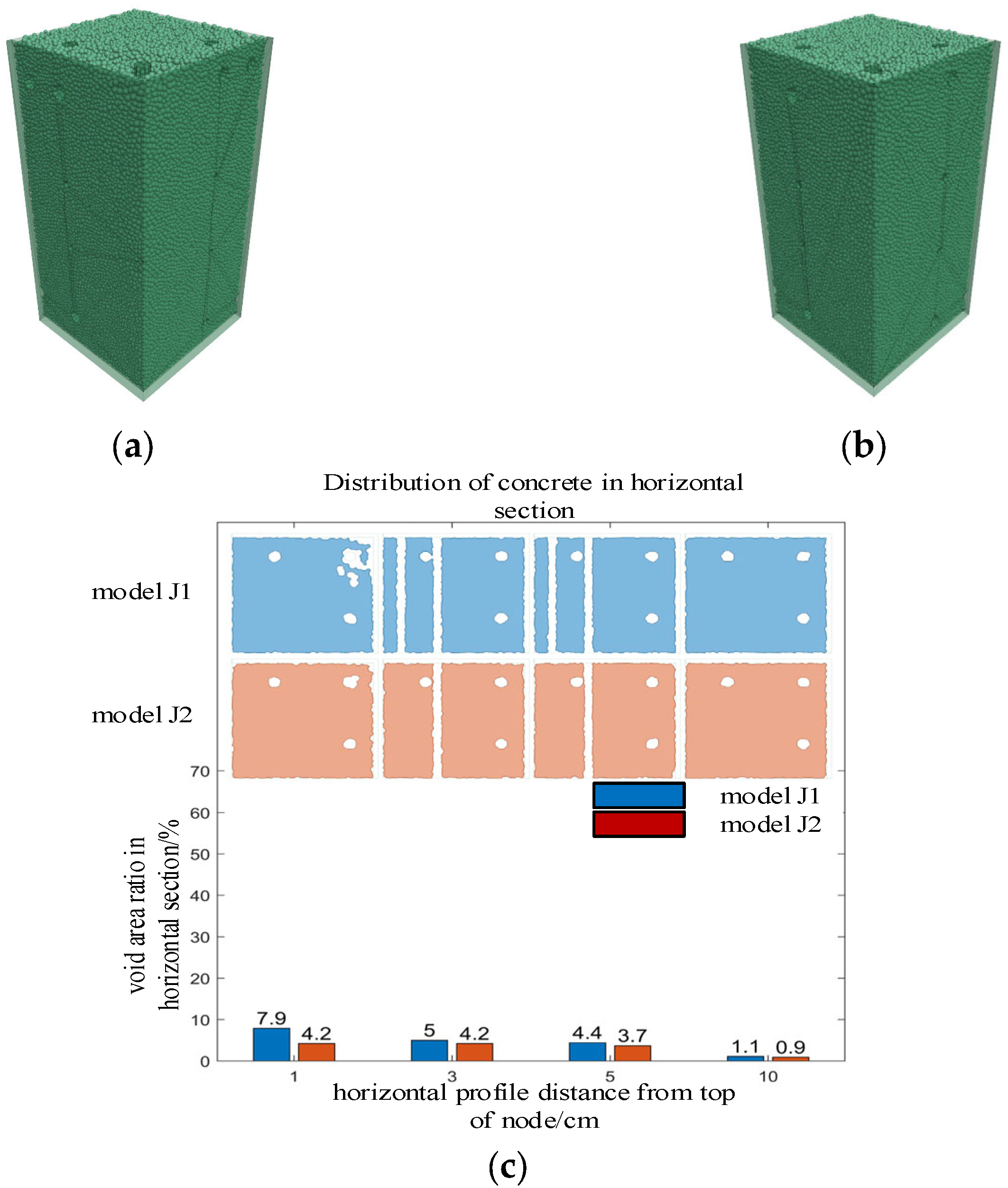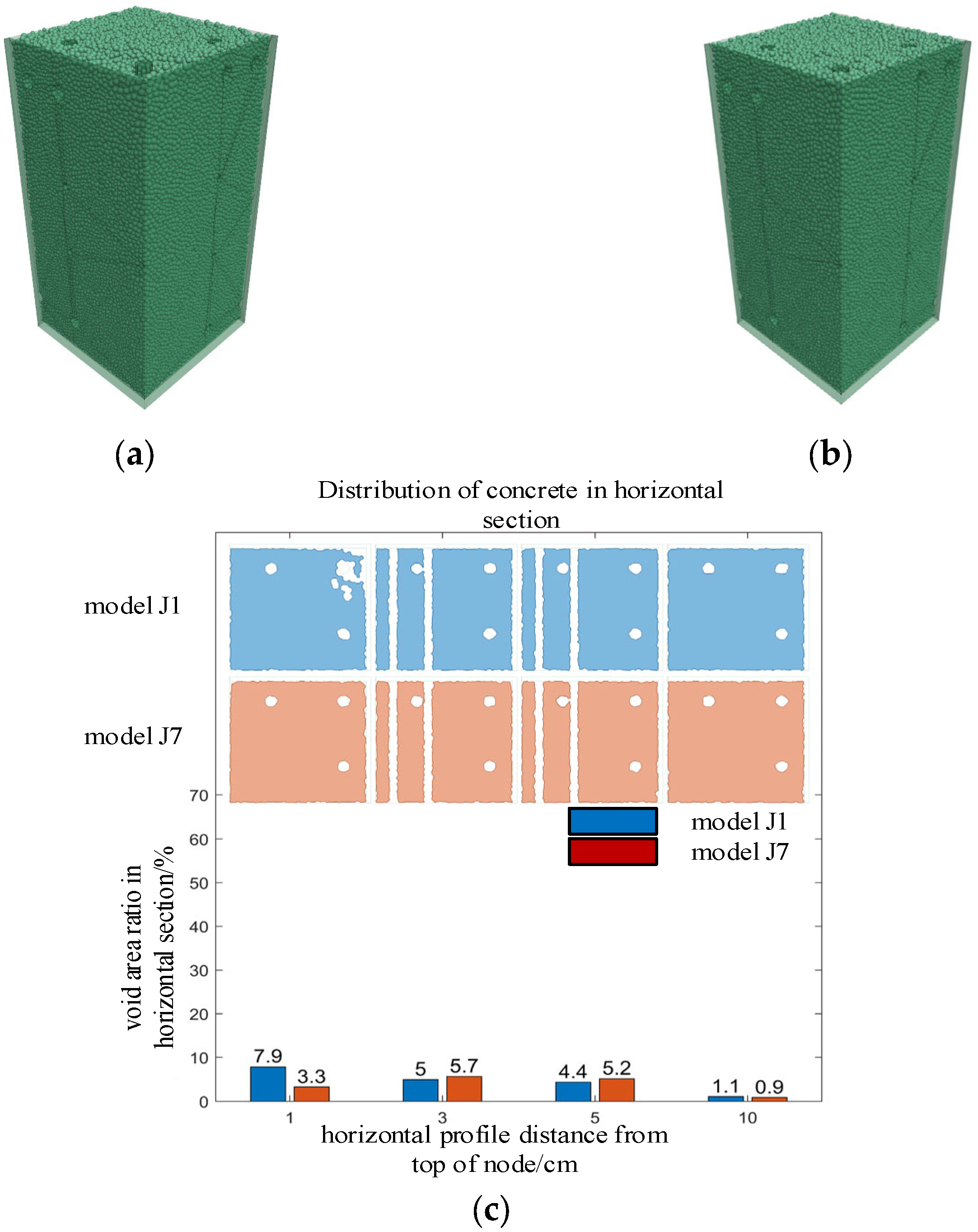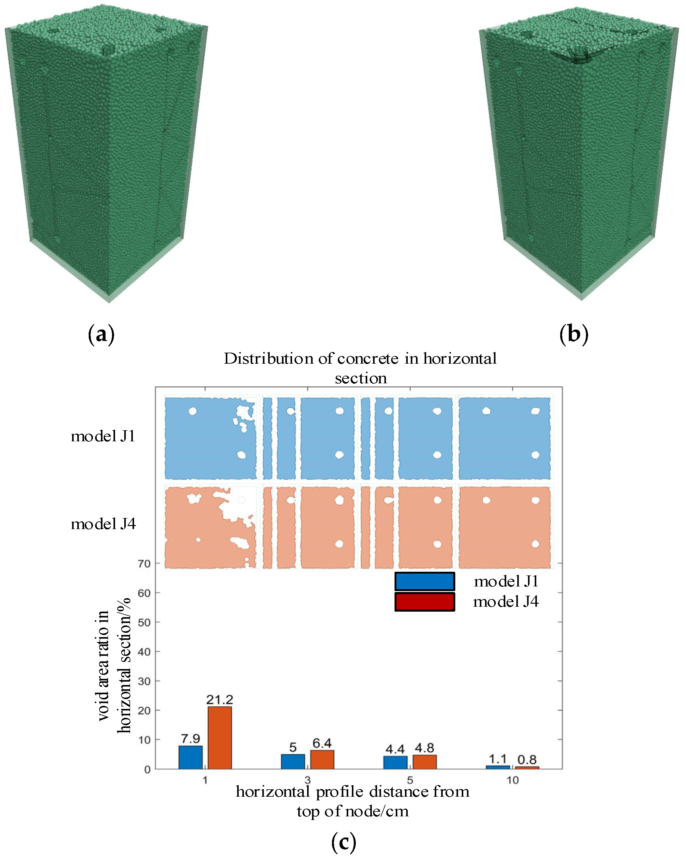 - Through pouring tests and numerical simulations of reinforced concrete beam–column joint pieces, it was found that the void volume and distribution patterns from both were basically consistent. The established numerical model could accurately simulate the rheological behavior of concrete and predict the size and location distribution of pouring defects.