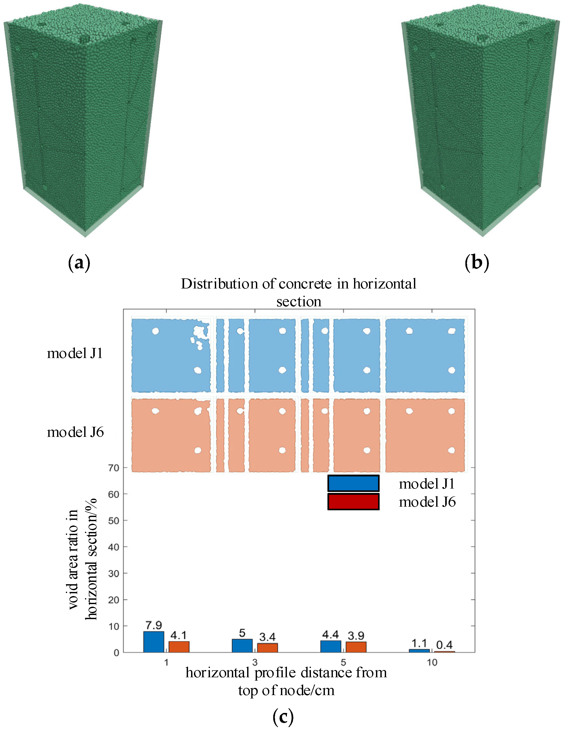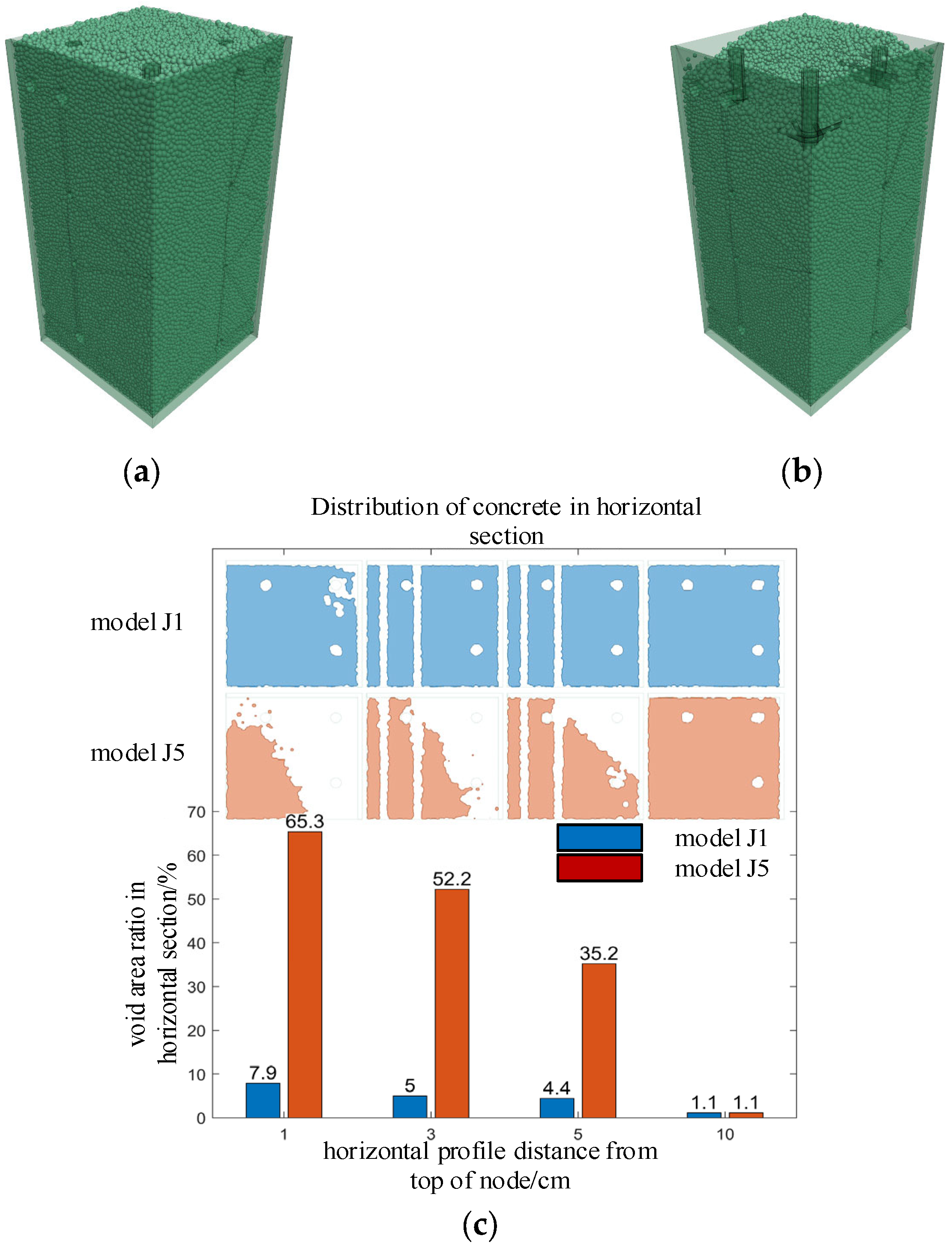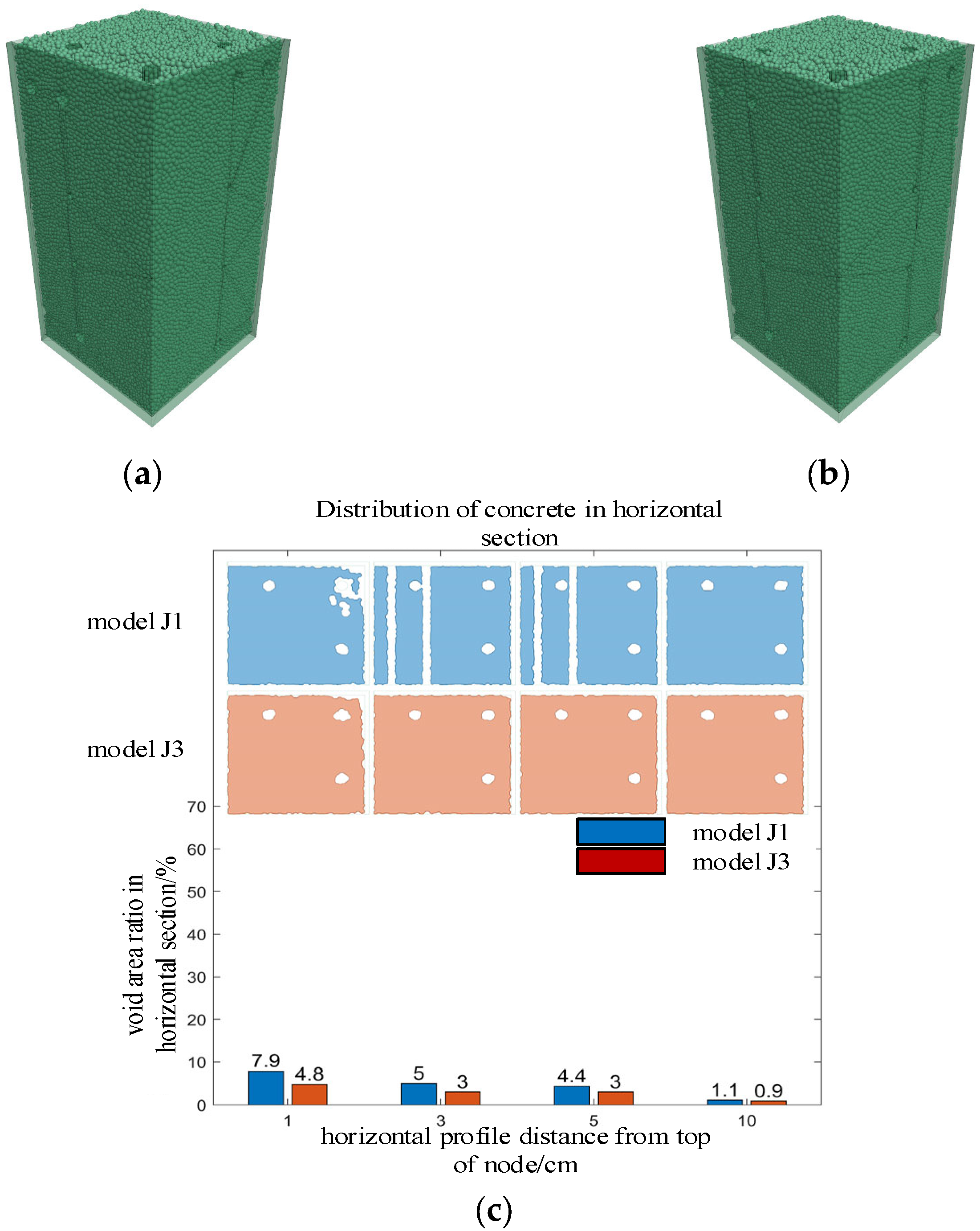 - Through pouring tests and numerical simulations of reinforced concrete beam–column joint pieces, it was found that the void volume and distribution patterns from both were basically consistent. The established numerical model could accurately simulate the rheological behavior of concrete and predict the size and location distribution of pouring defects.