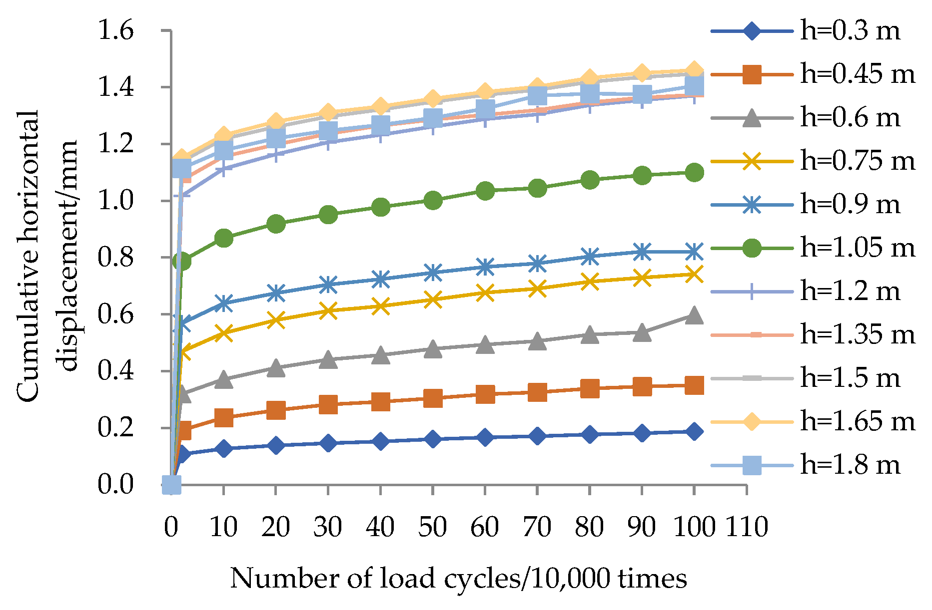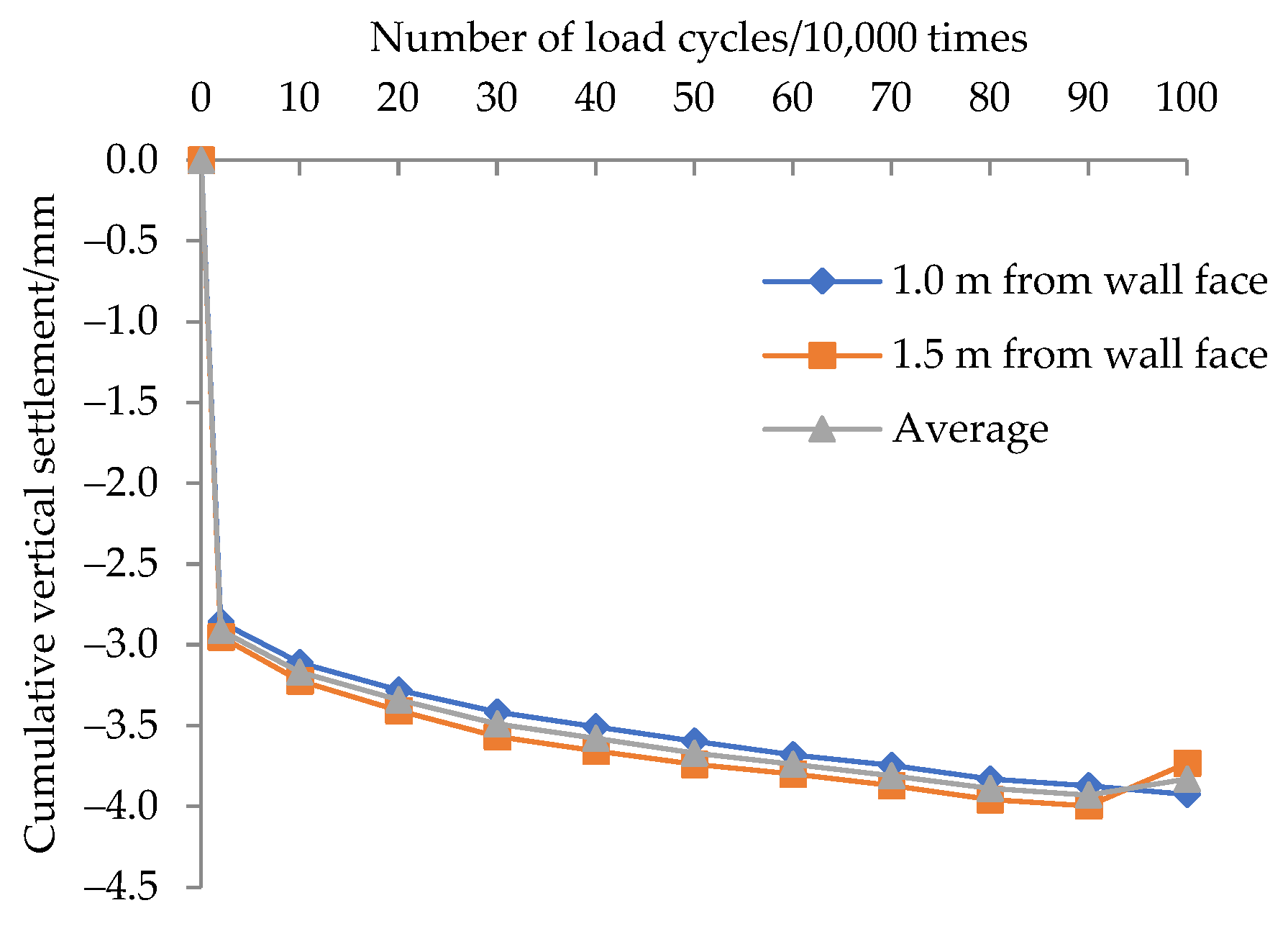 - The maximum average settlement stabilizes at 0.21%H. A significant portion of the total settlement occurs within the first 20,000 load cycles. Beyond this point, settlement increments become negligible, accounting for only 24.02% of the total settlement.