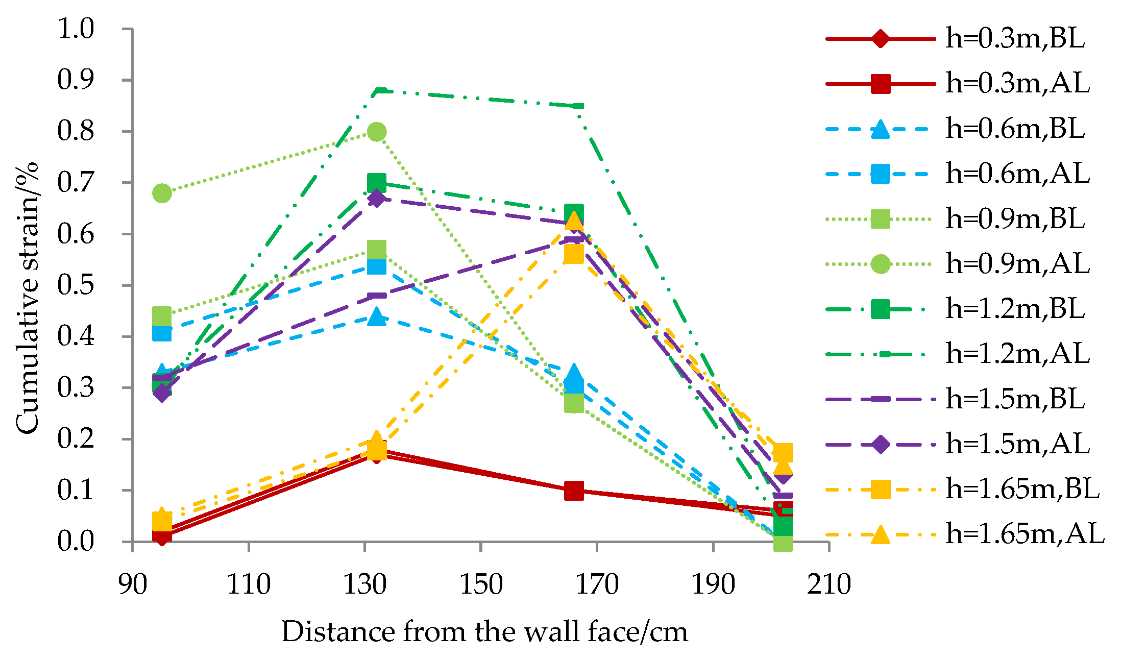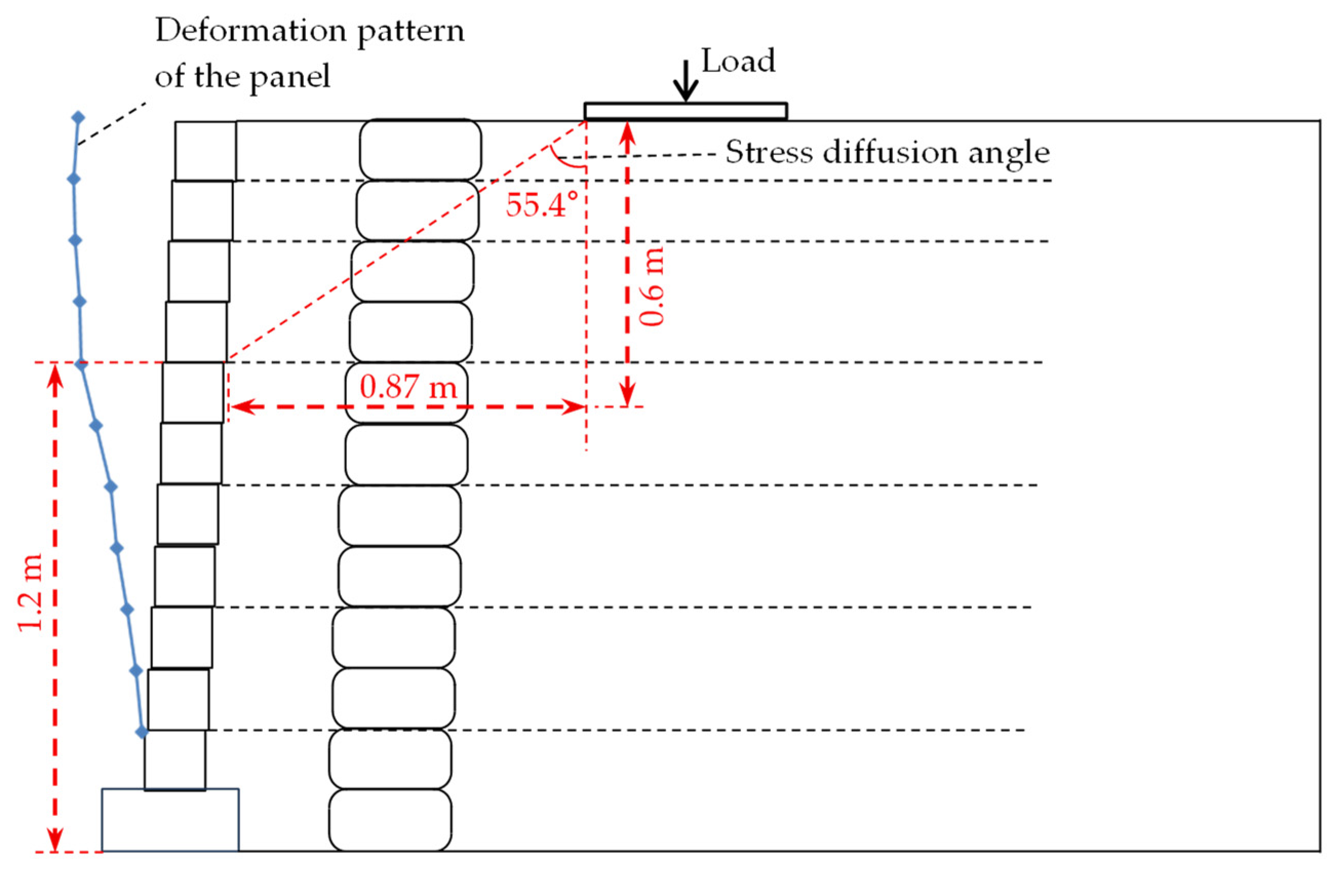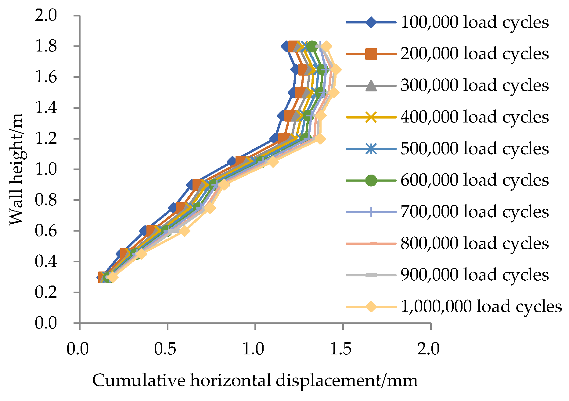 - The horizontal deformation of the panel increases with an increasing number of load cycles and eventually stabilizes, reaching a maximum value of 0.08%H. The deformation progressively increases from the base of the panel to its top. After 20,000 load cycles, deformation growth becomes minimal and relatively uniform along the height of the wall, indicating a stress diffusion angle of 55.4°.