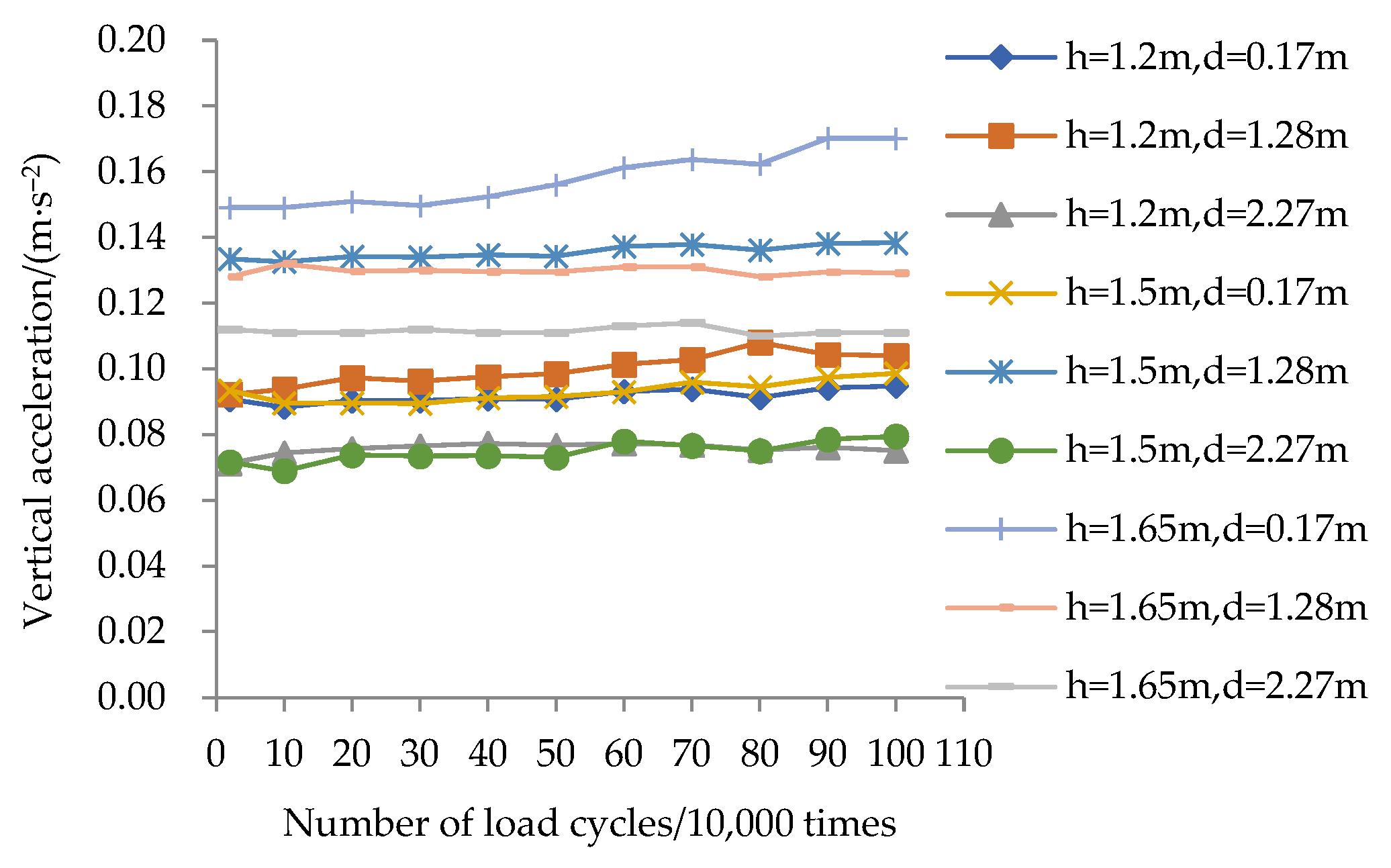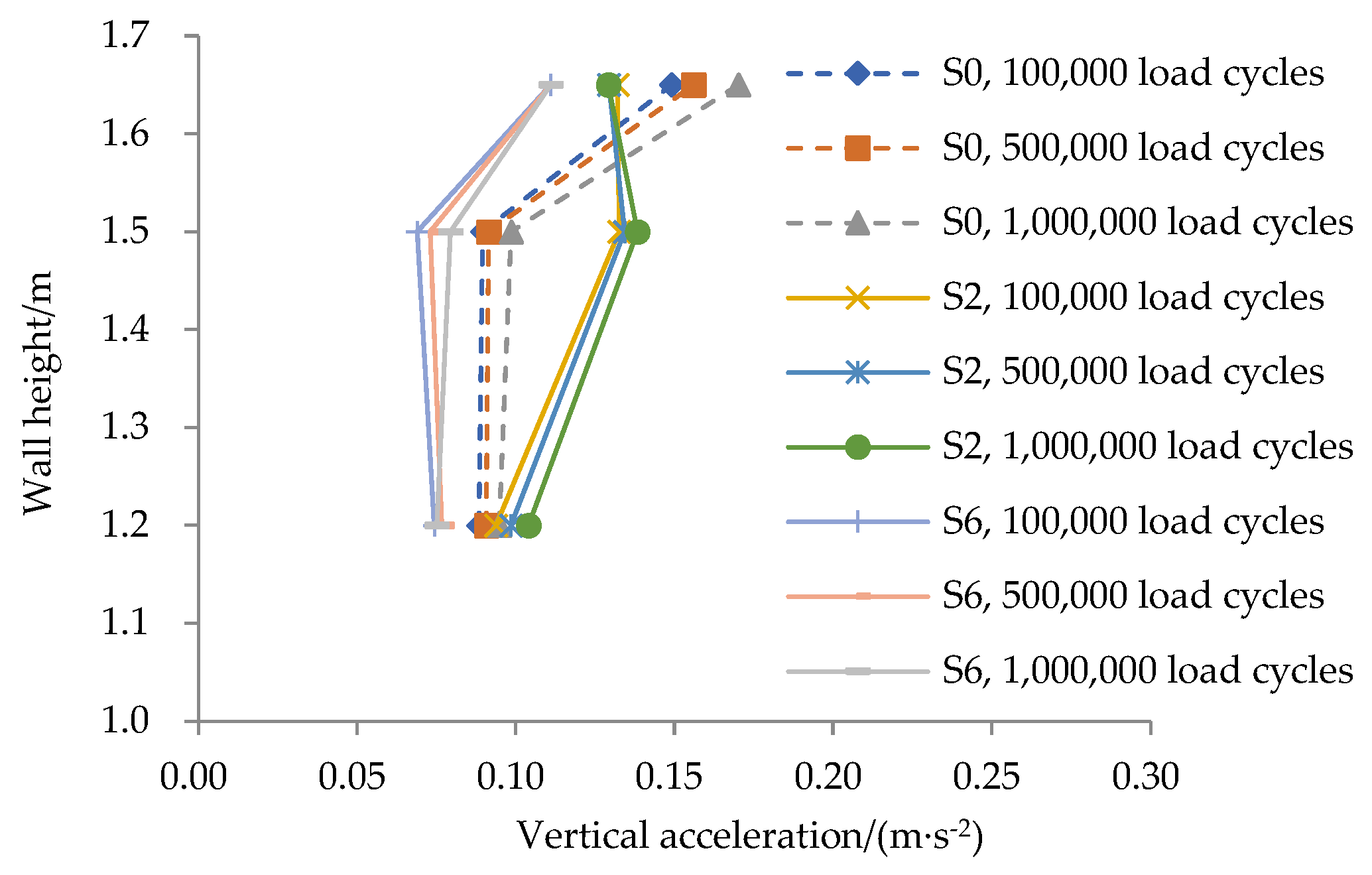 - The vertical acceleration increases marginally with an increasing number of load cycles, with a maximum increment of 0.02 m/s2. The attenuation of the vertical acceleration is slower at the section corresponding to the load center, while it proceeds more rapidly at the sections located behind both the panel and the WRSZ. Through these differing attenuation processes, accelerations within the reinforced zone converge and remain lower than those in the non-reinforced zone.