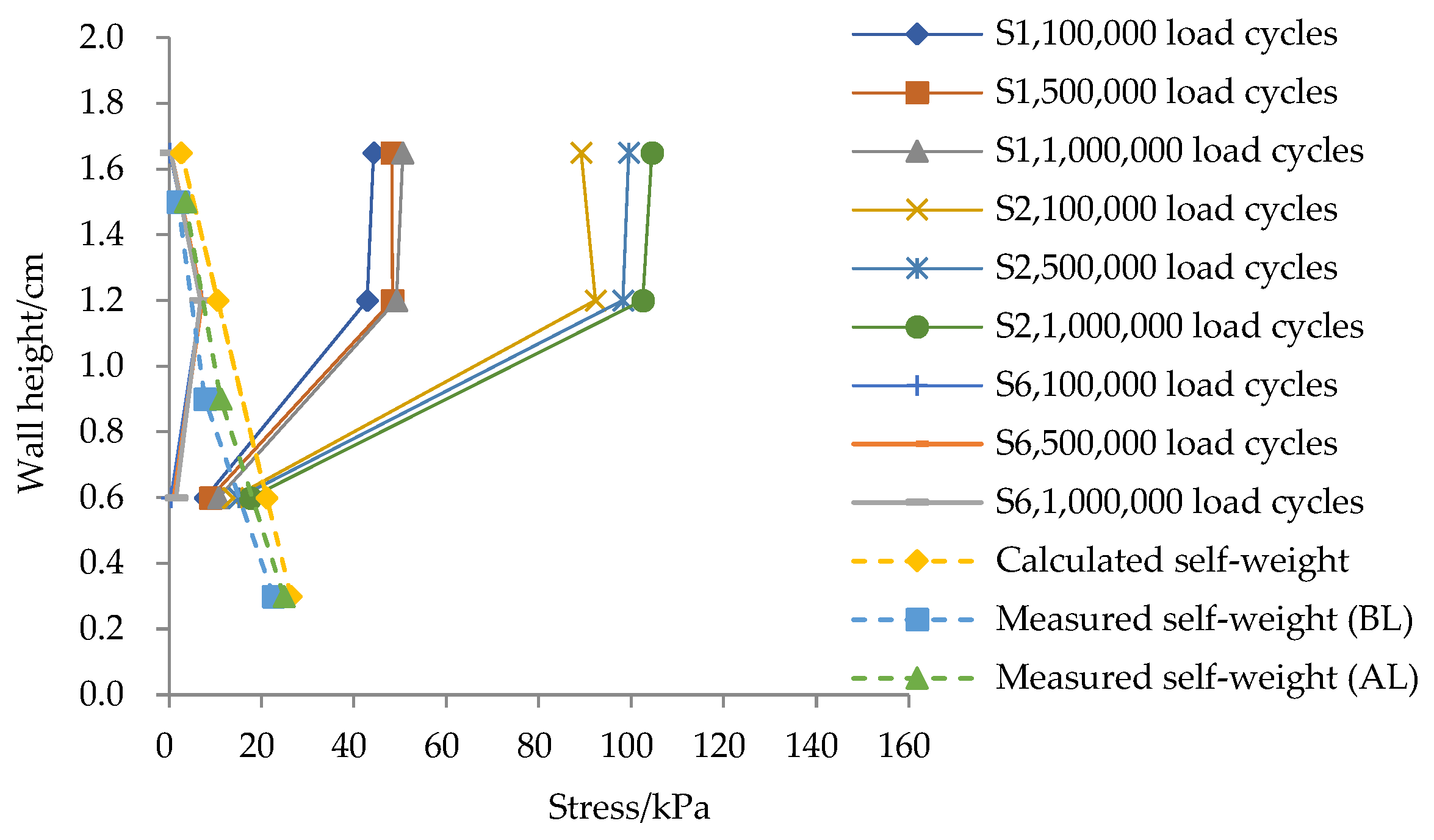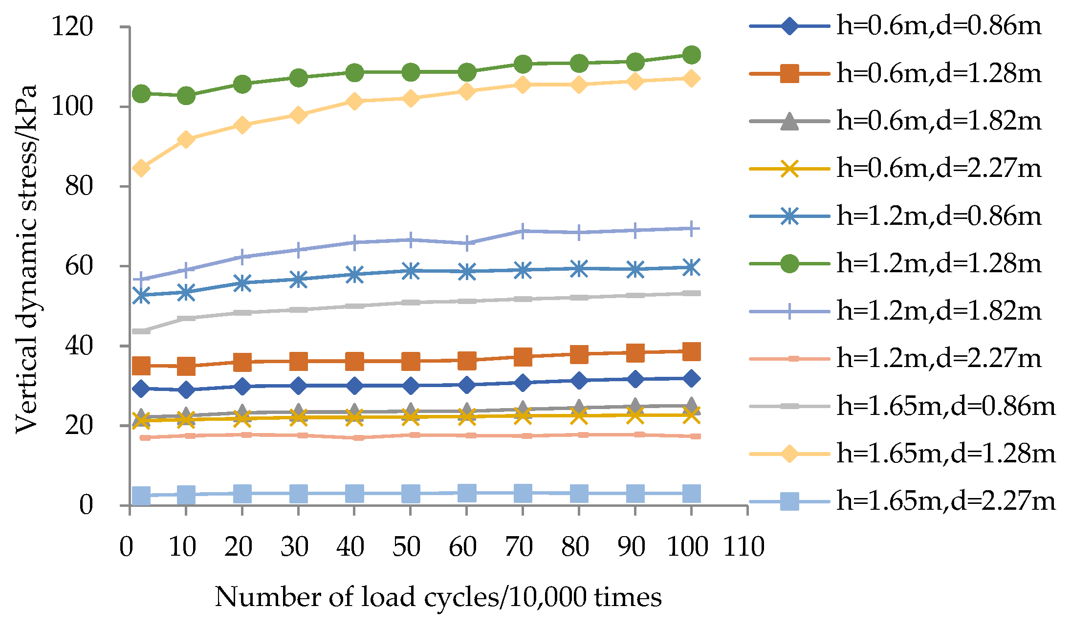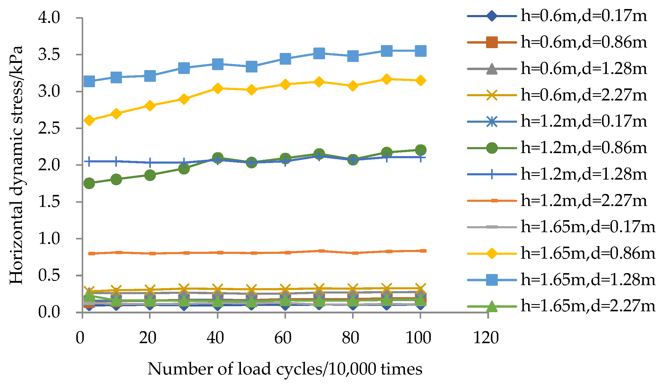 - Both vertical and horizontal dynamic stresses increase and subsequently stabilize with continued cyclic loading. The decay pattern of vertical dynamic stress aligns with Boussinesq analytical solutions for foundation soils, confirming elastic behavior. The vertical and horizontal dynamic stresses gradually decrease on the vertical sections within the range of load application, and they show a trend of first increasing and then decreasing on the vertical sections outside the range of load application. The horizontal dynamic stress acting on the back of the panel remains low and uniformly distributed. Measured self-weight stress increases during loading but remains below analytically calculated values.