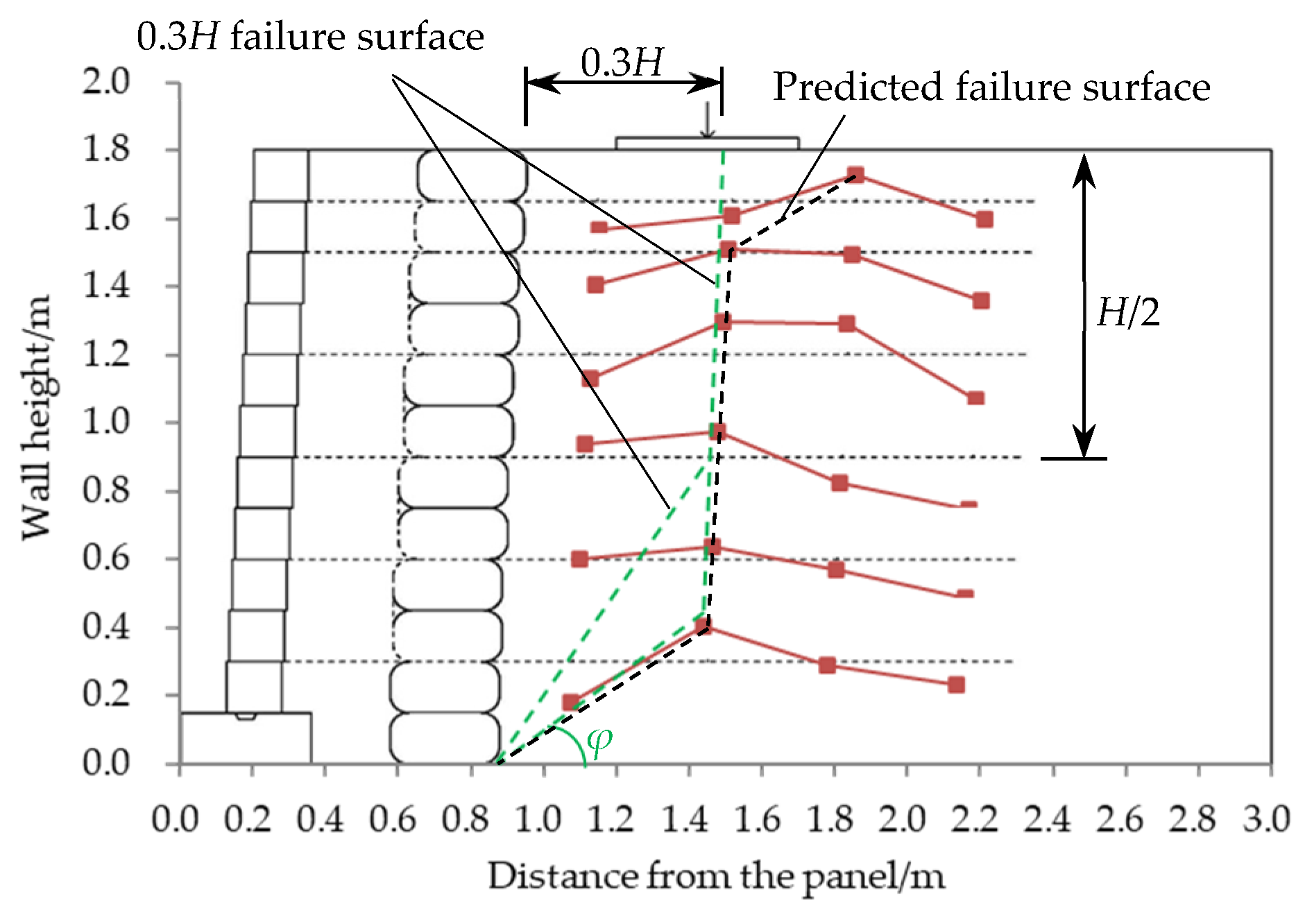 - The cumulative strain of the geogrid exhibits a single-peak distribution along the reinforcement length, with a maximum value of 0.88%, corresponding to maximum tensile stress reaching 20.33% of the geogrid’s ultimate tensile strength. The predicted failure surface approximates a bilinear configuration, comprising a line parallel to the wall face located 0.3H behind the soil bags and a second line inclined at an angle equal to the soil’s internal friction angle (φ) relative to the horizontal plane.