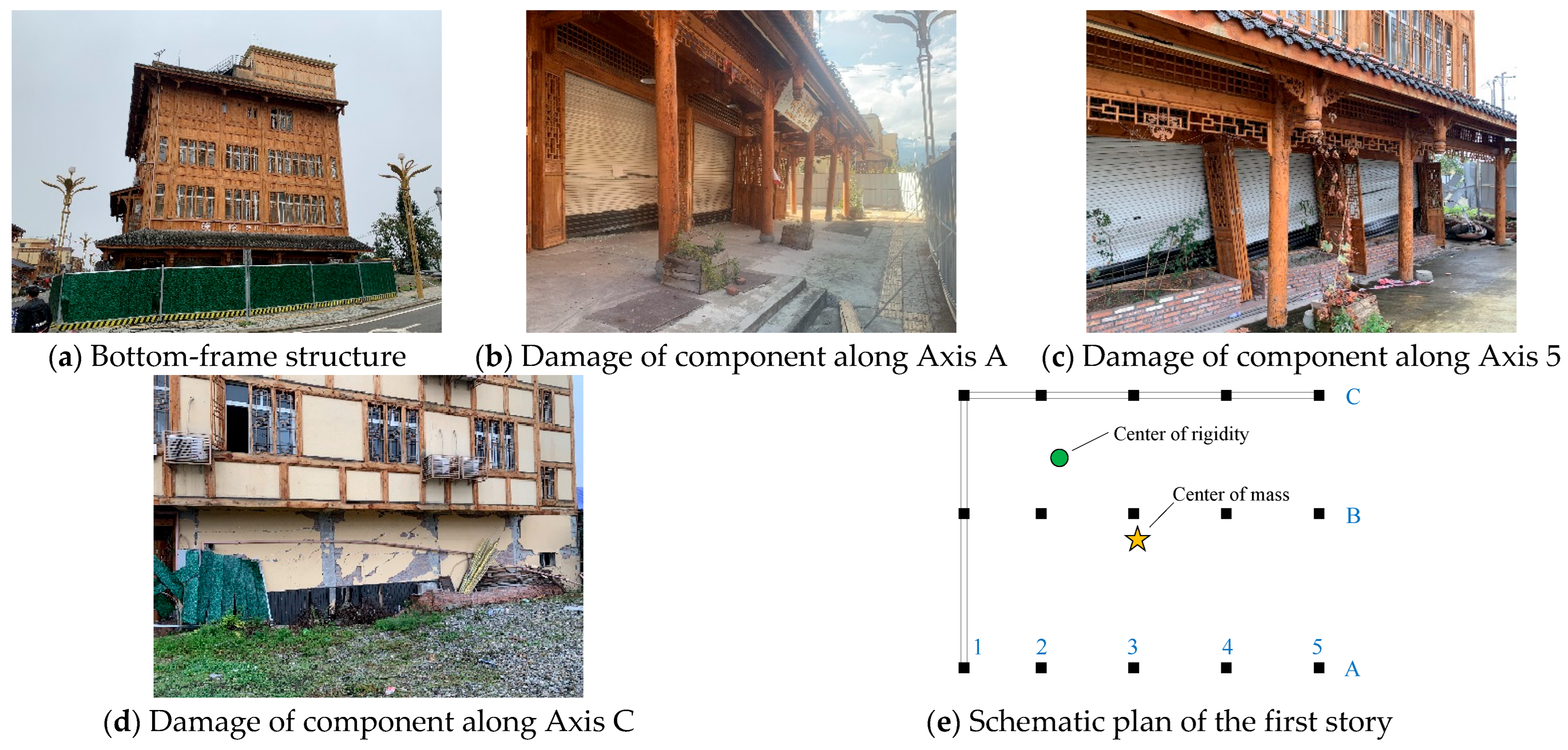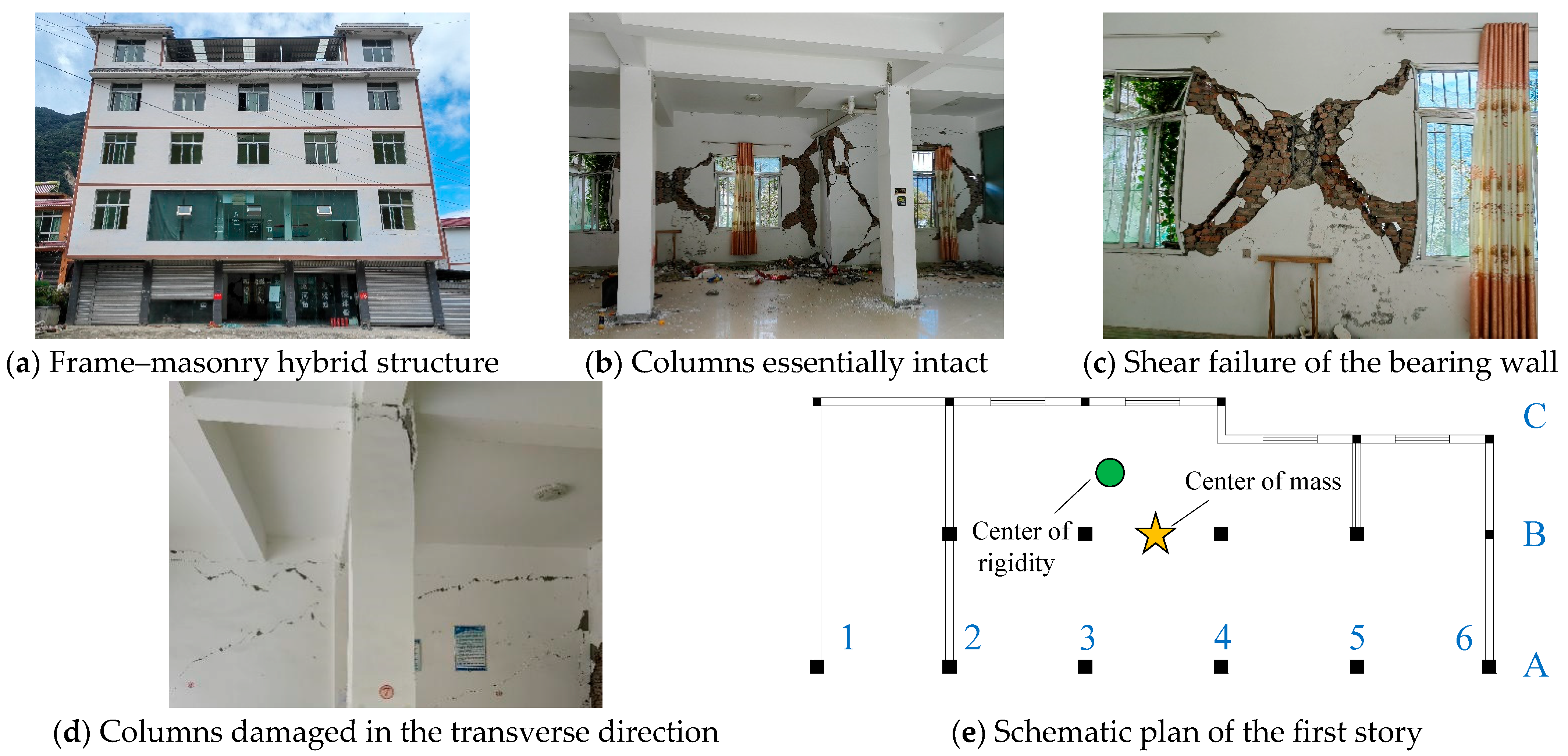 Extensive damage surveys revealed that high-stiffness components, such as frame–infill wall assemblies and masonry load-bearing walls, often sustained severe damage, while low-stiffness components at the same story, such as frame columns, remained relatively intact. Figure 2a shows a five-story guesthouse with a frame–masonry hybrid system. This building was located 9.8 km from the earthquake epicenter. The first story consisted of a frame–masonry composite structure, whereas the upper stories were masonry. Owing to the weakness of the first story, damage was concentrated at this level, while the upper stories remained largely undamaged. A schematic plan of the first story is shown in Figure 2e.