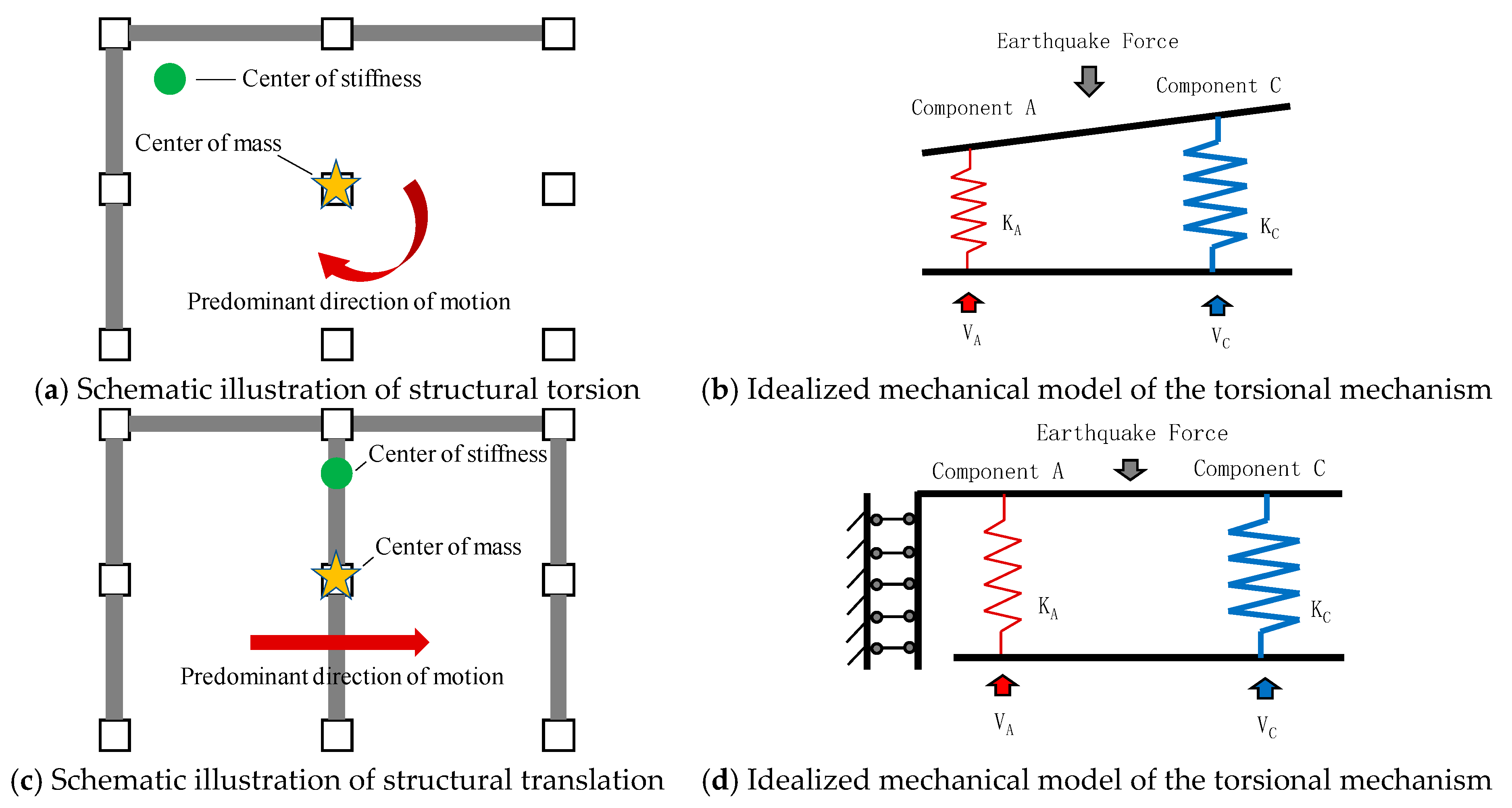 Figure 5a shows the behavior and failure mechanism of Building A. Under the torsional mechanism in Figure 4b, both stiff (Component C) and flexible (Component A) elements are subjected to the same internal force. Component A reaches its deformation limit and fails, while Component C remains intact since the force does not reach its ultimate capacity. Such complete torsional failure is particularly damaging to seismic performance, though it generally occurs in buildings with highly irregular wall distributions, such as corner buildings.