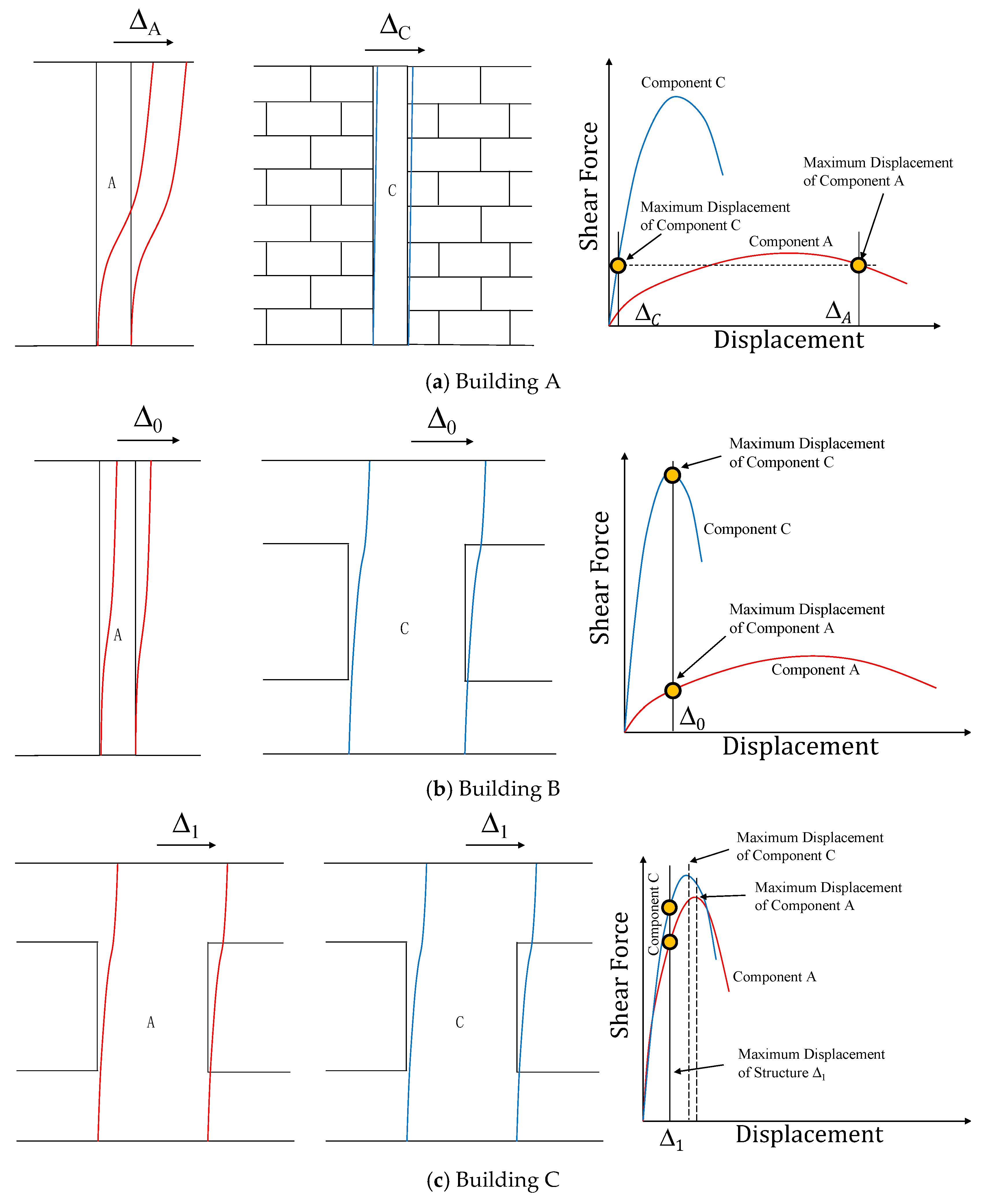 Figure 5c depicts Building C, where components are mainly stiff, high-strength, but low-deformability members (Components C and A). The proximity of the center of mass and center of rigidity leads to a translation-dominated response, with all components undergoing identical displacements. Unlike Building B, both member types in Building C have similar constitutive relationships and uniformly high load-bearing capacities. Although deformability is limited and ductility is poor, most components contribute significantly to overall strength. With proper arrangement of lateral load-resisting elements, the structure achieves very high total load-bearing capacity. In seismic practice, such buildings resist earthquake forces primarily through strength, and due to the brittle nature of their members, damage rarely occurs before the ultimate strength is reached.
