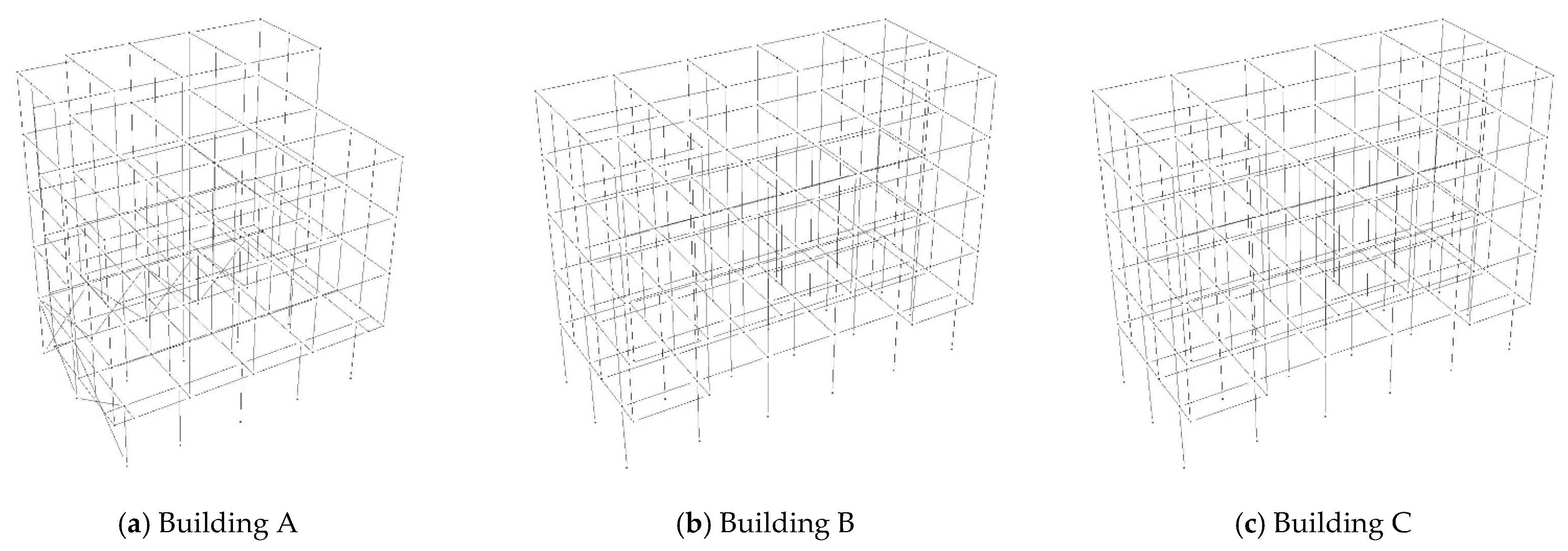 The selection was guided by a single criterion: the observed damage patterns of structural components and the distribution of load-bearing walls. Based on this consideration, three representative cases were chosen: a bottom-frame structure (Building A), a frame–masonry hybrid structure (Building B), and a masonry structure (Building C). Collectively, these buildings typify the predominant seismic failure patterns observed in the affected area. It should be emphasized that the focus of this study is not merely on structural typology, but rather on the mechanical behavior of structures and their components; the identified failure mechanisms may therefore be applicable across different structural types.