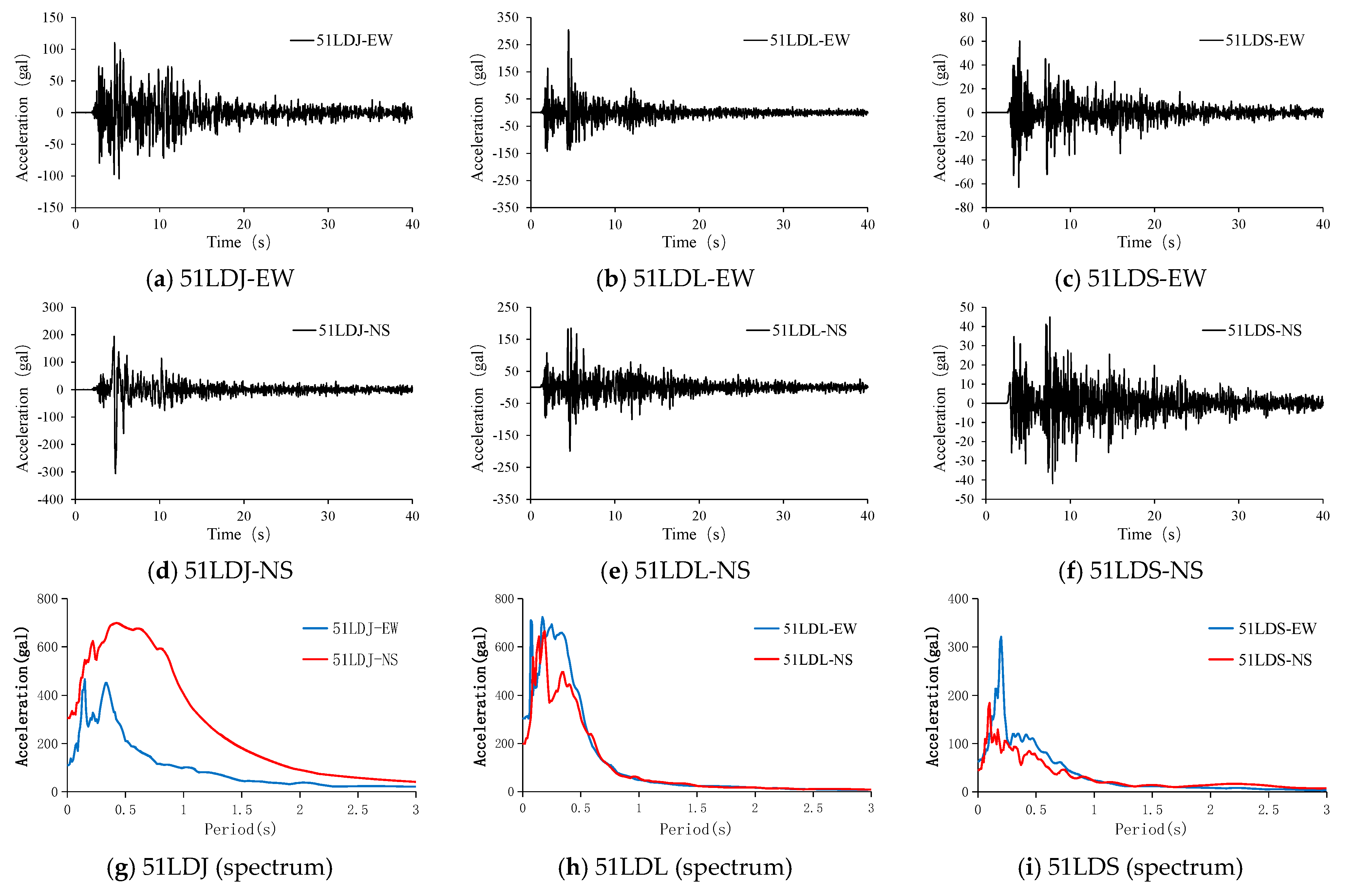 These three records were selected because they were obtained directly from the 2022 Luding earthquake and therefore most accurately represent the seismic input experienced by the investigated buildings. Notably, their response spectra encompass different amplification ranges—51LDJ at 0–1 s, 51LDL at 0–0.5 s, and 51LDS at 0–0.25 s—ensuring a diverse representation of frequency content (Figure 9g–i). Since the focus of this study is on capturing generalized structural responses and validating failure mechanisms, rather than conducting probabilistic fragility assessments, these three records are sufficient and appropriate for the intended analysis.
