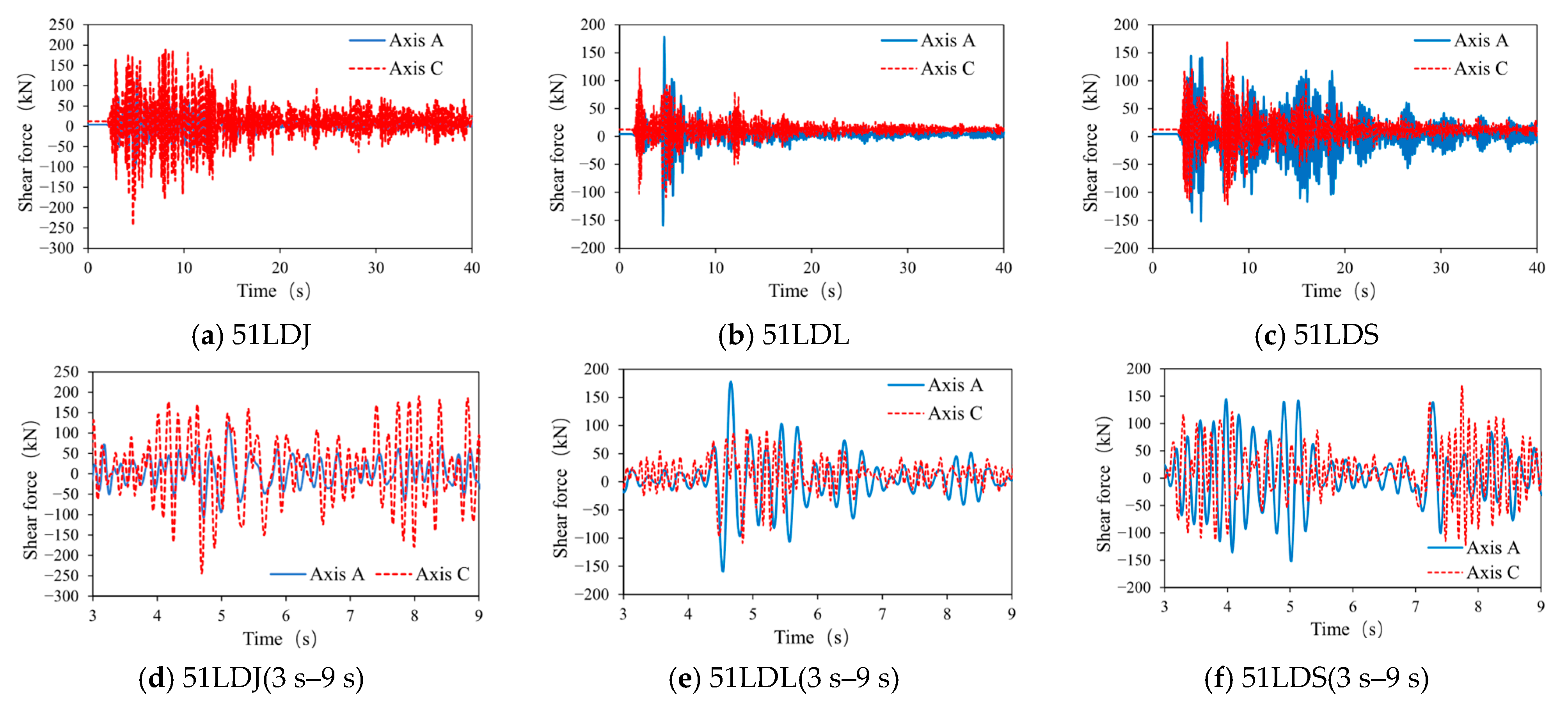 Figure 14. Time-history curves of shear forces for components along Axes A and C in Building B.