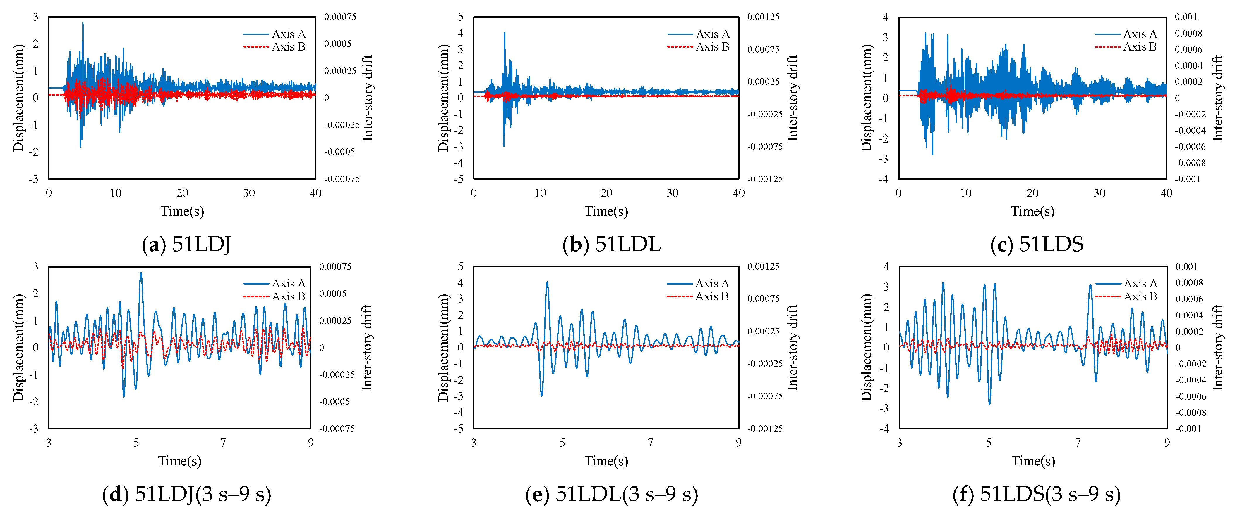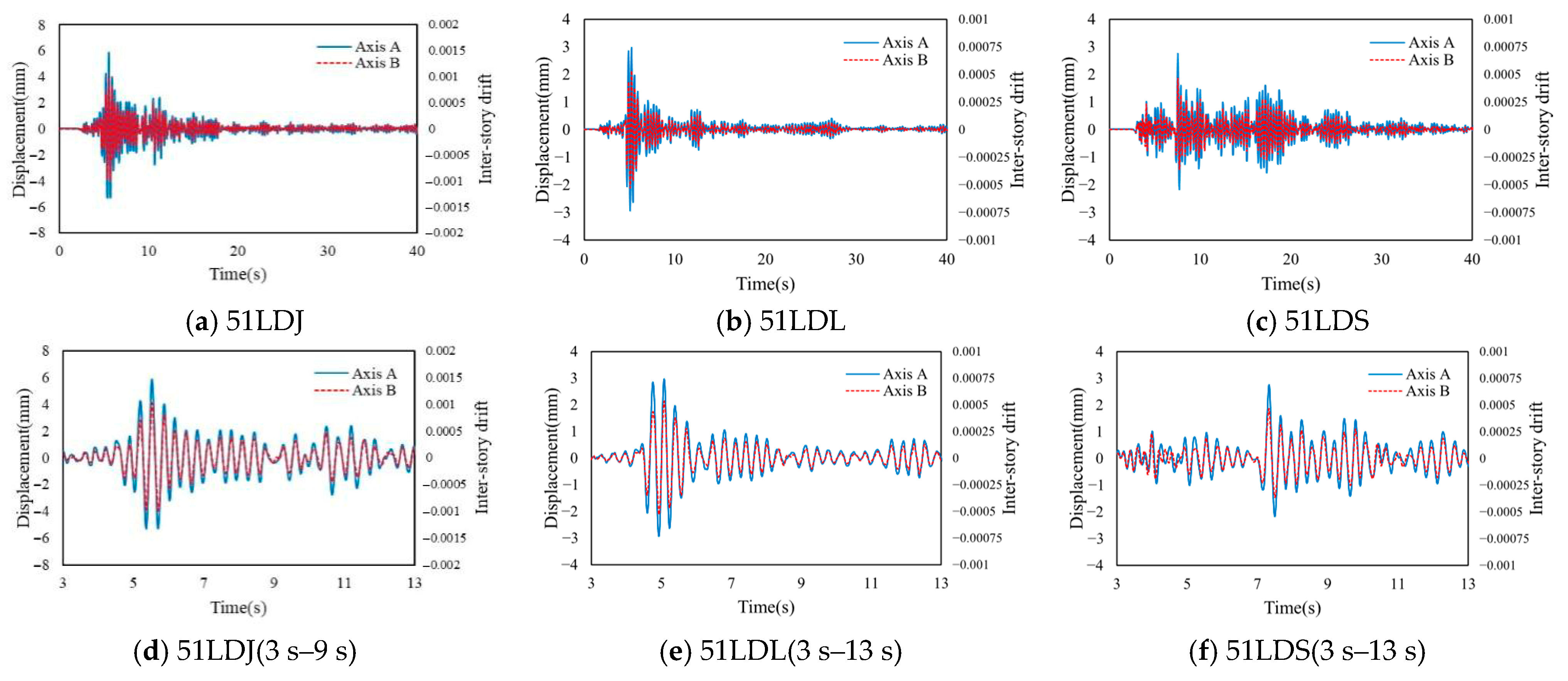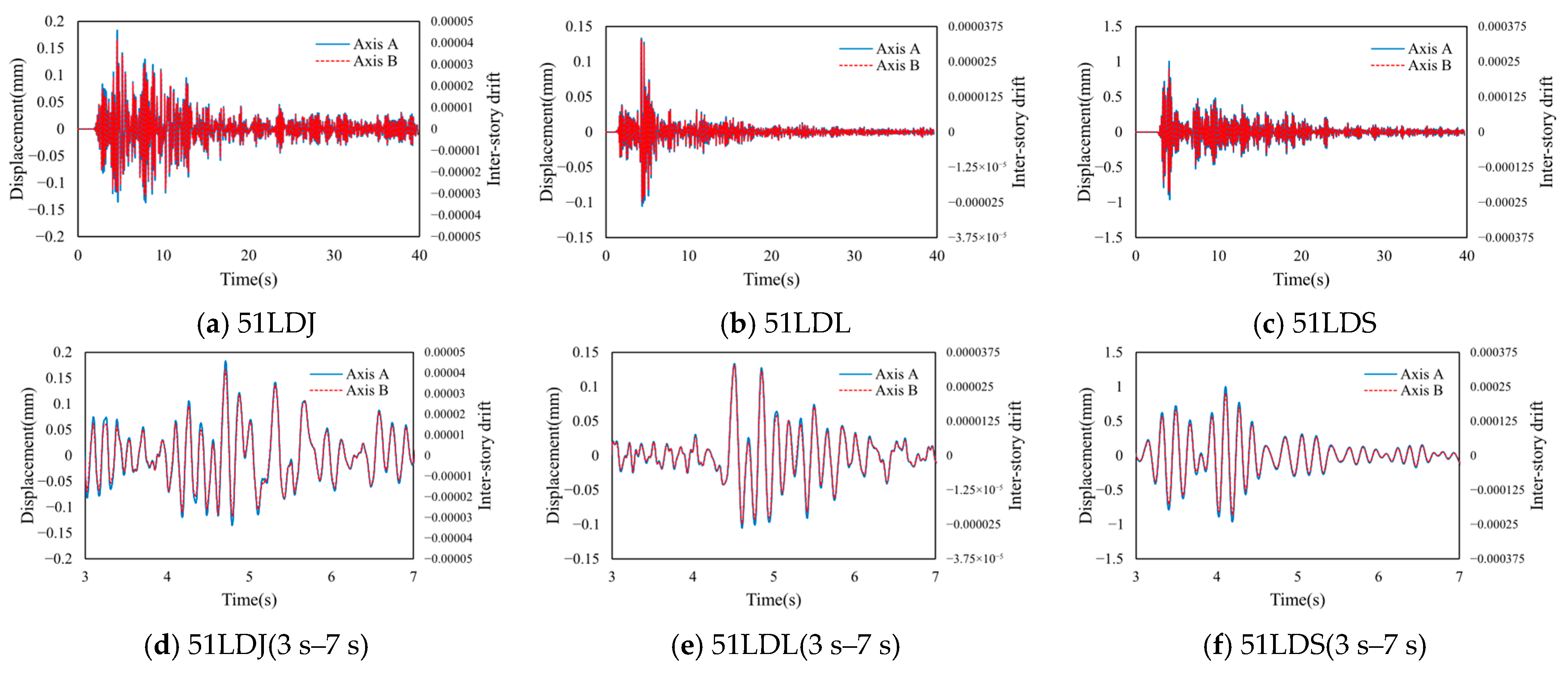 Figure 16. Time-history curves of displacements for components along Axes A and C under the 51LDL record scaled to 0.3 g in Building B.