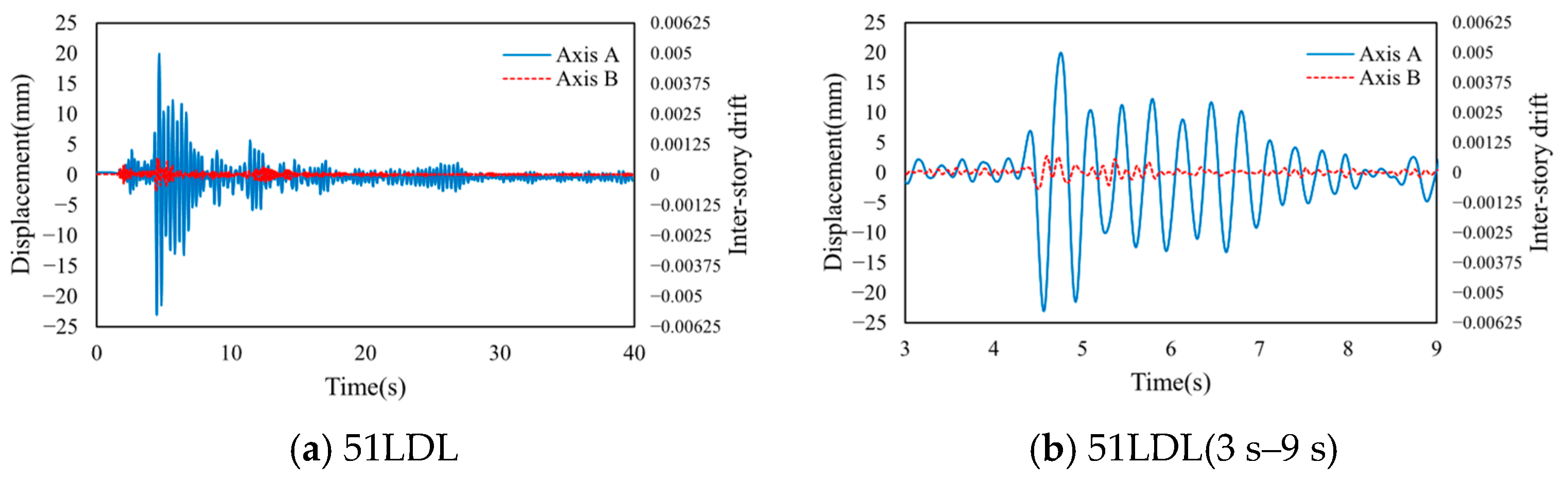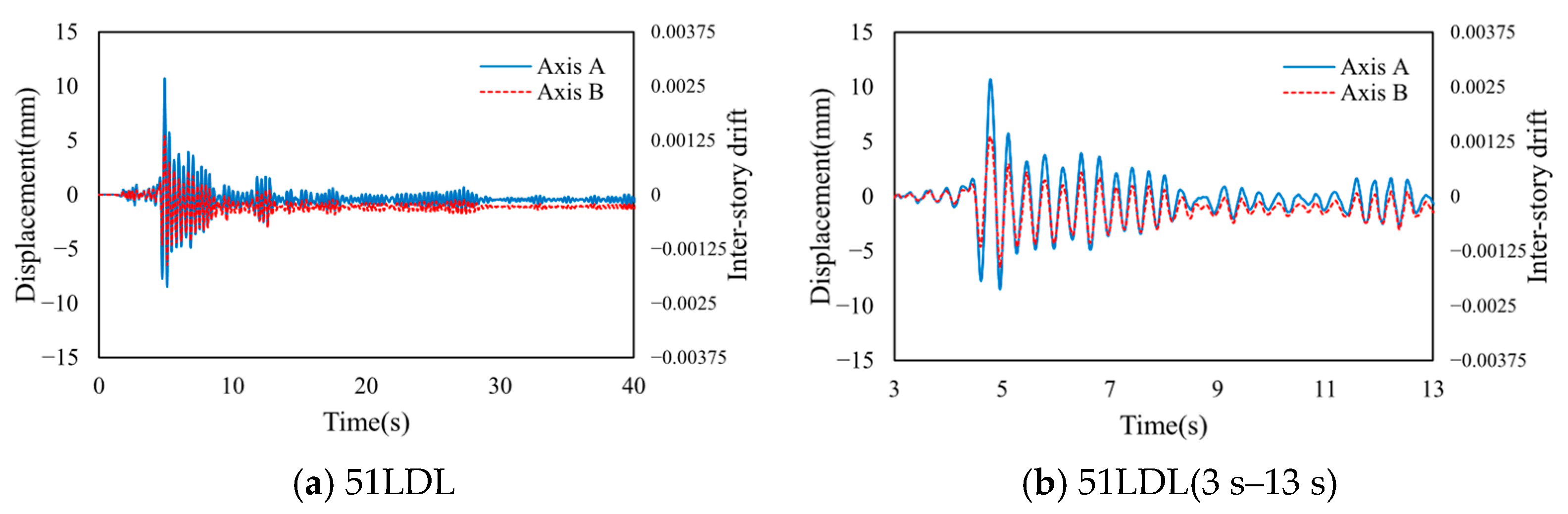 When the input ground motion is scaled to a peak acceleration of 0.5 g, the structure experiences severe damage. Results under the 51LDL record are provided for illustration. Figure 12 displays the time-history of displacements for components along Axes A and C. As the members enter the inelastic range, the displacement ratio between the two axes remains largely unchanged, with a maximum value of 7.12:1—similar to that under the 0.1 g case—indicating that the stiffness of Axis A frame columns progressively degrades due to yielding, while the infill walls in Axis C simultaneously enter the inelastic stage.