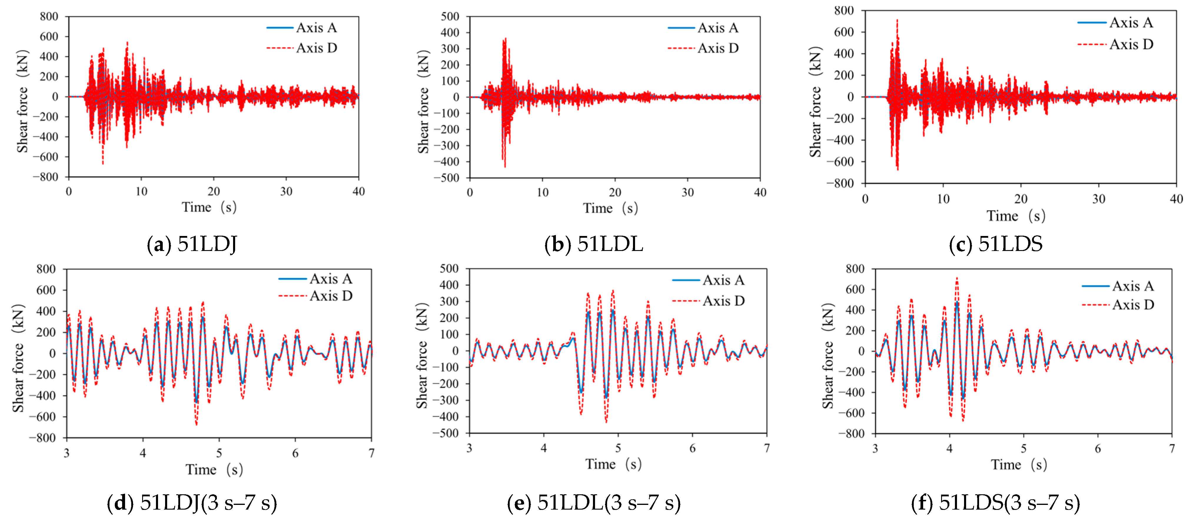 Figure 18. Time-history curves of shear forces for components along Axes A and D in Building C.
