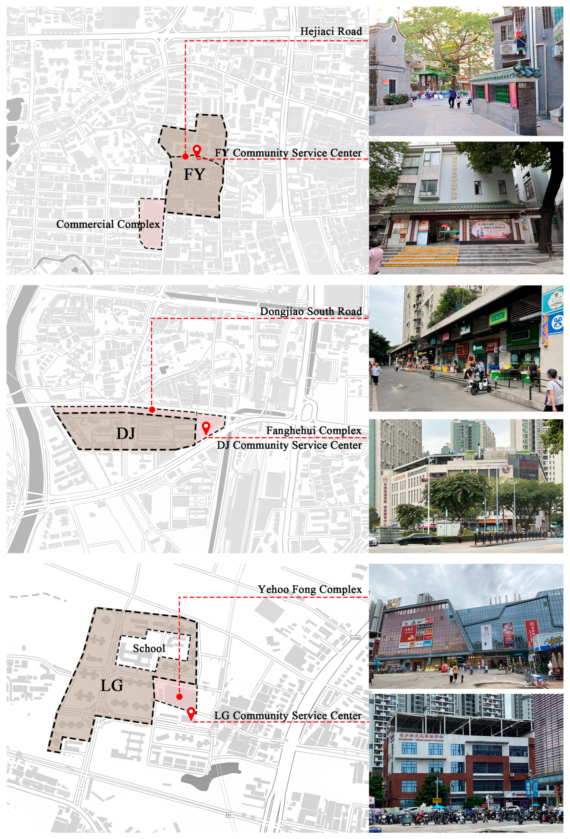 Based on these patterns, three representative communities were selected: FY (clustered), DJ (linear), and LG (patchy). FY and DJ have higher aging shares (~25% and ~20% aged 60+), indicating strong demand for age-friendly services; LG has a lower aging rate (~7%) but represents a newly developed affordable-housing area with weaker surrounding services, offering a contrasting context for accessibility and activation in patchy structures.