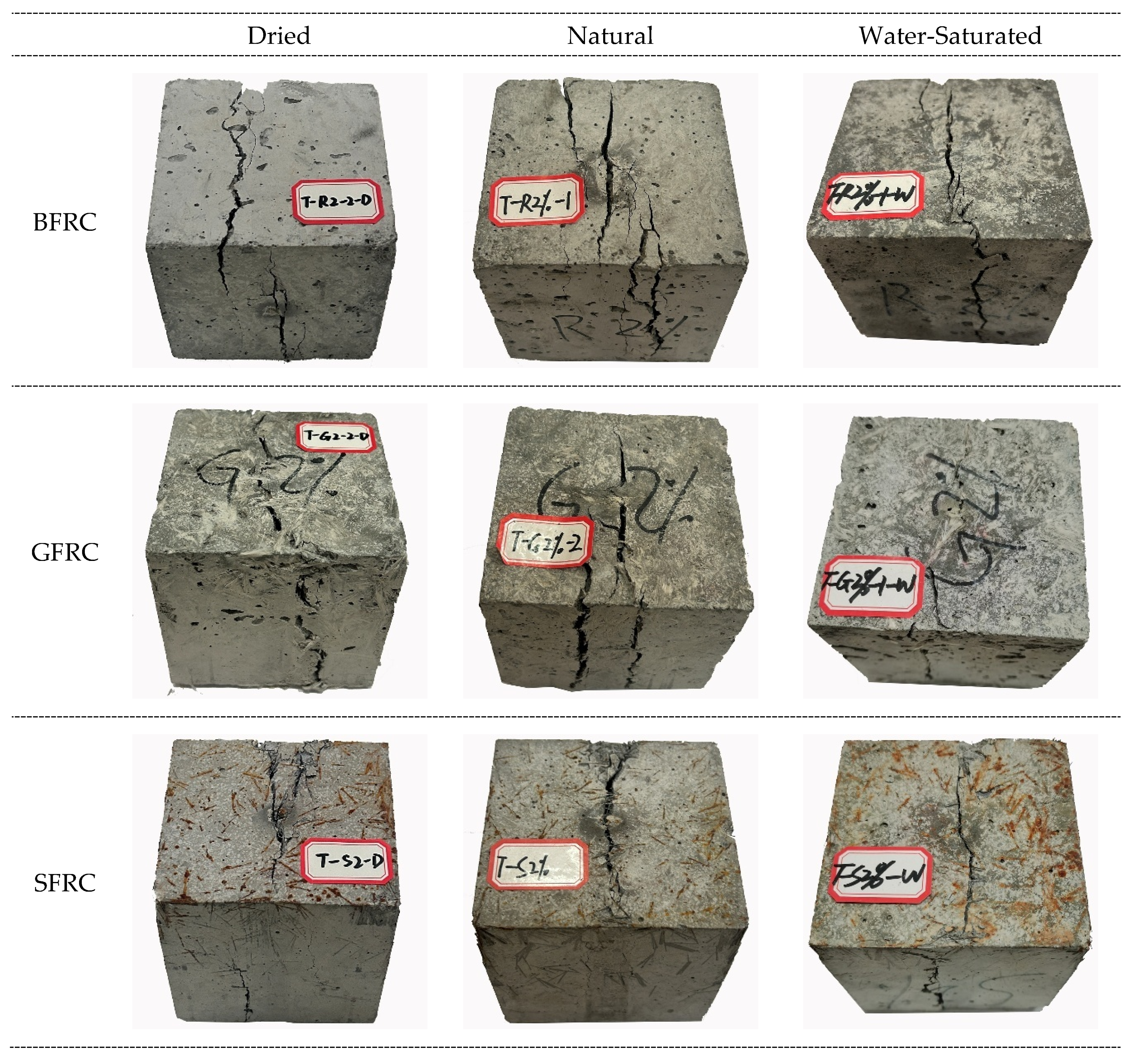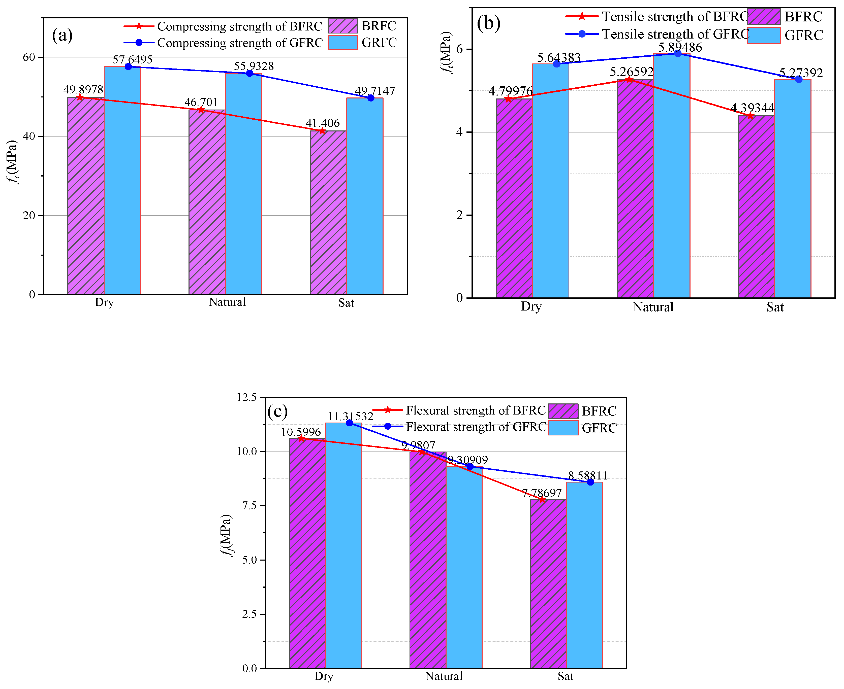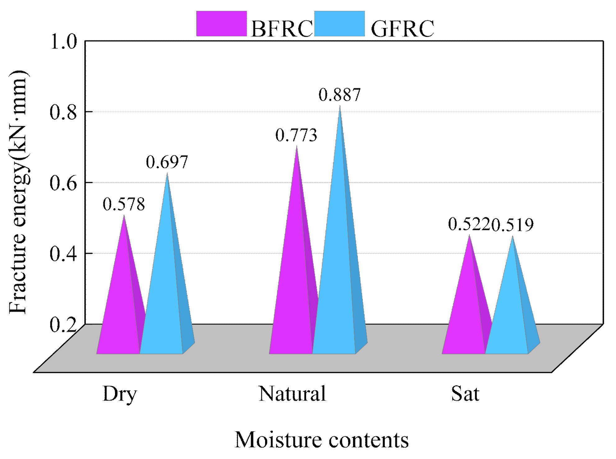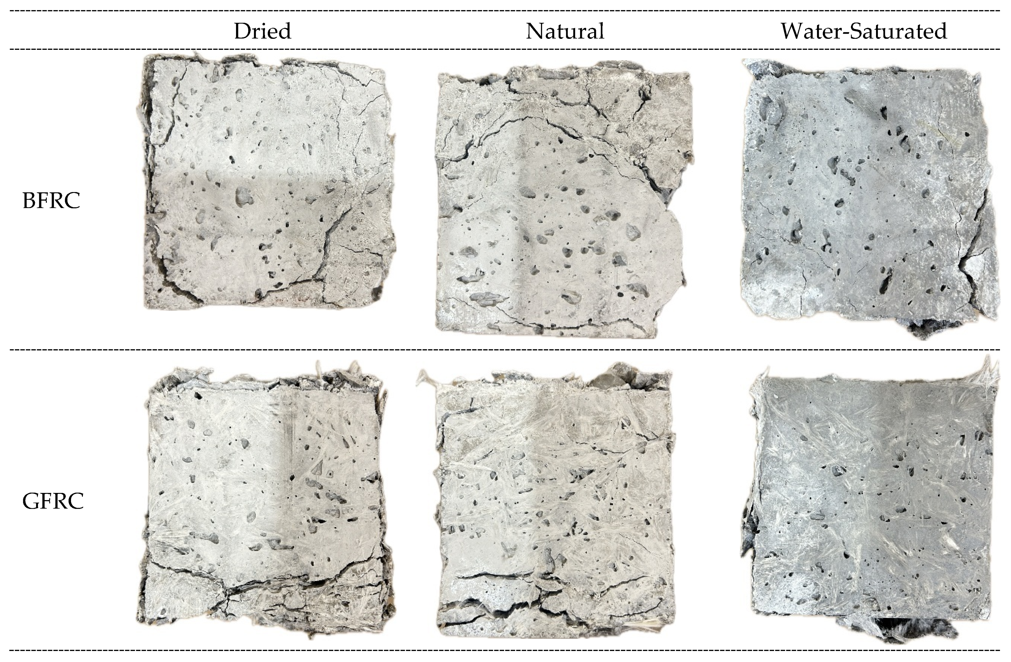 - Similarly to ordinary concrete, the overall mechanical strength of FRC decreased with increasing saturation. However, toughness and energy absorption first increased and then decreased, reaching their peak values in the natural state. This trend was attributed not only to the effect of moisture on the concrete matrix but also to the influence of water on fiber properties.